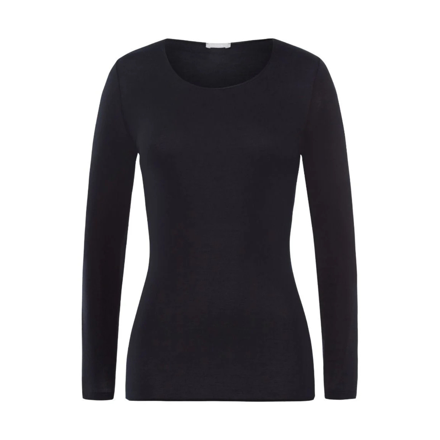 Hanro Black Long Sleeve Shirt. Black mercerized cotton long sleeves shirt with flat satin trims and a hemless bottom. Seamless sides for the perfect fit, can be worn on its own as a casual, everyday top or for layering.