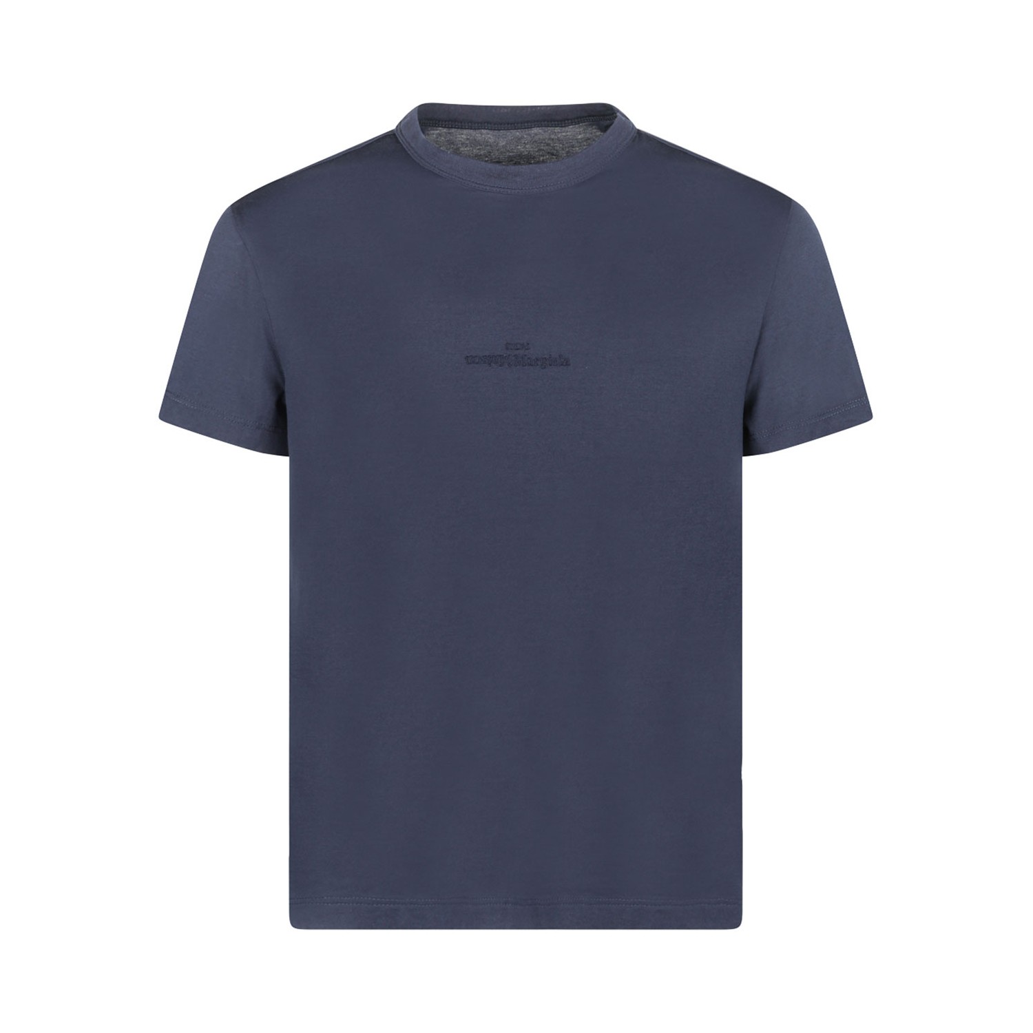 Maison Margiela Navy Blue T-Shirt. Navy blue cotton t-shirt, jersey texture, embroidered logo at the chest. Crew neck, drop shoulder, short sleeves, straight hem.