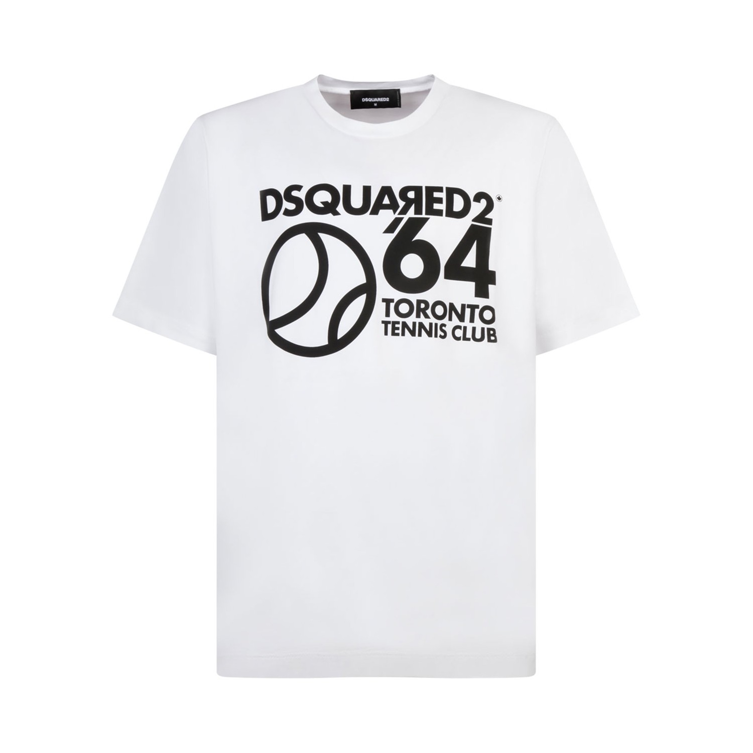 Dsquared2 Tennis Club T-Shirt. White cotton t-shirt with lettering and pattern printed on front, ribbed crew neck, two-needle finished edges.