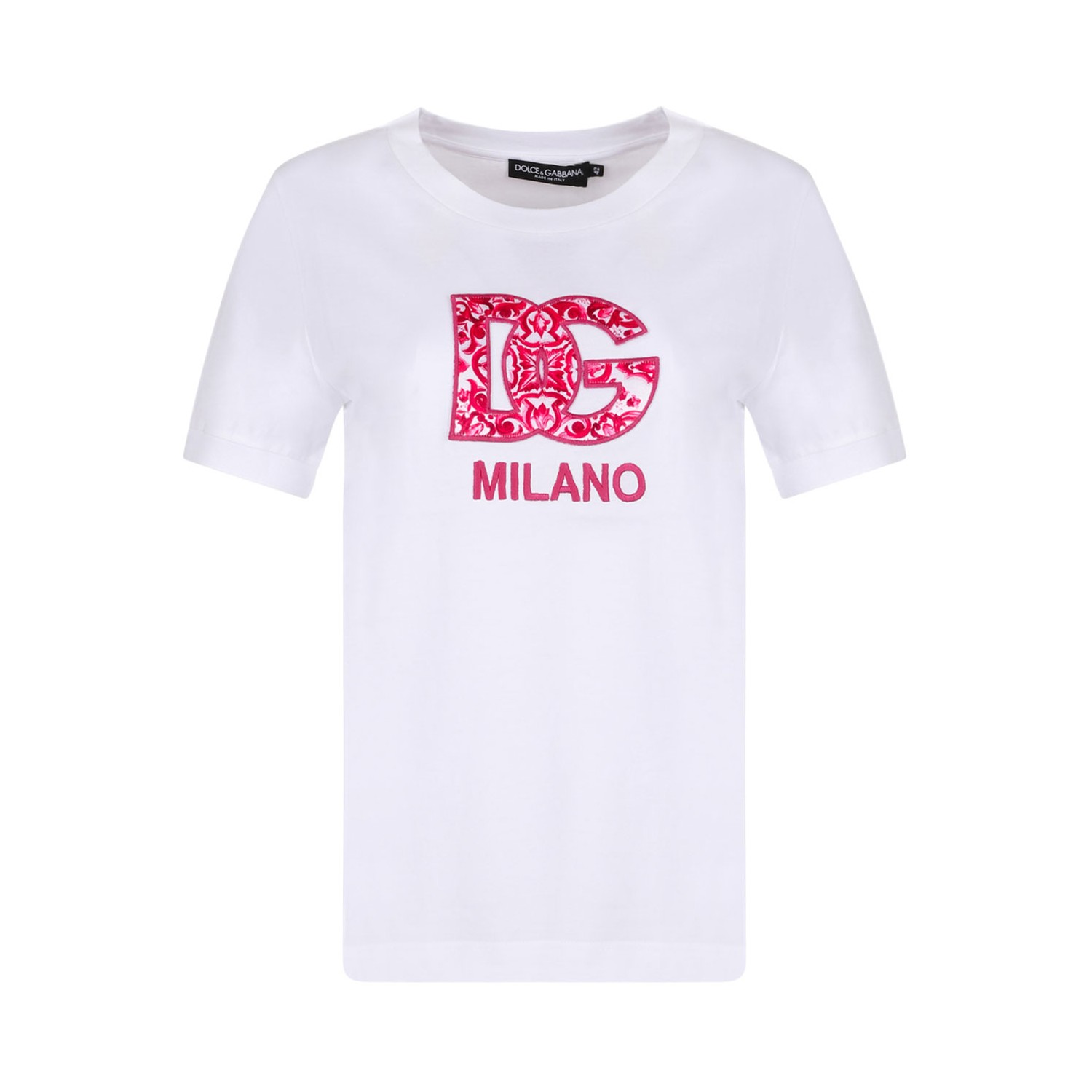Dolce & Gabbana White Logo Embroidered T-Shirt. White cotton t-shirt, pink logo embroidered to the front, crew neck, short sleeves and straight hem.