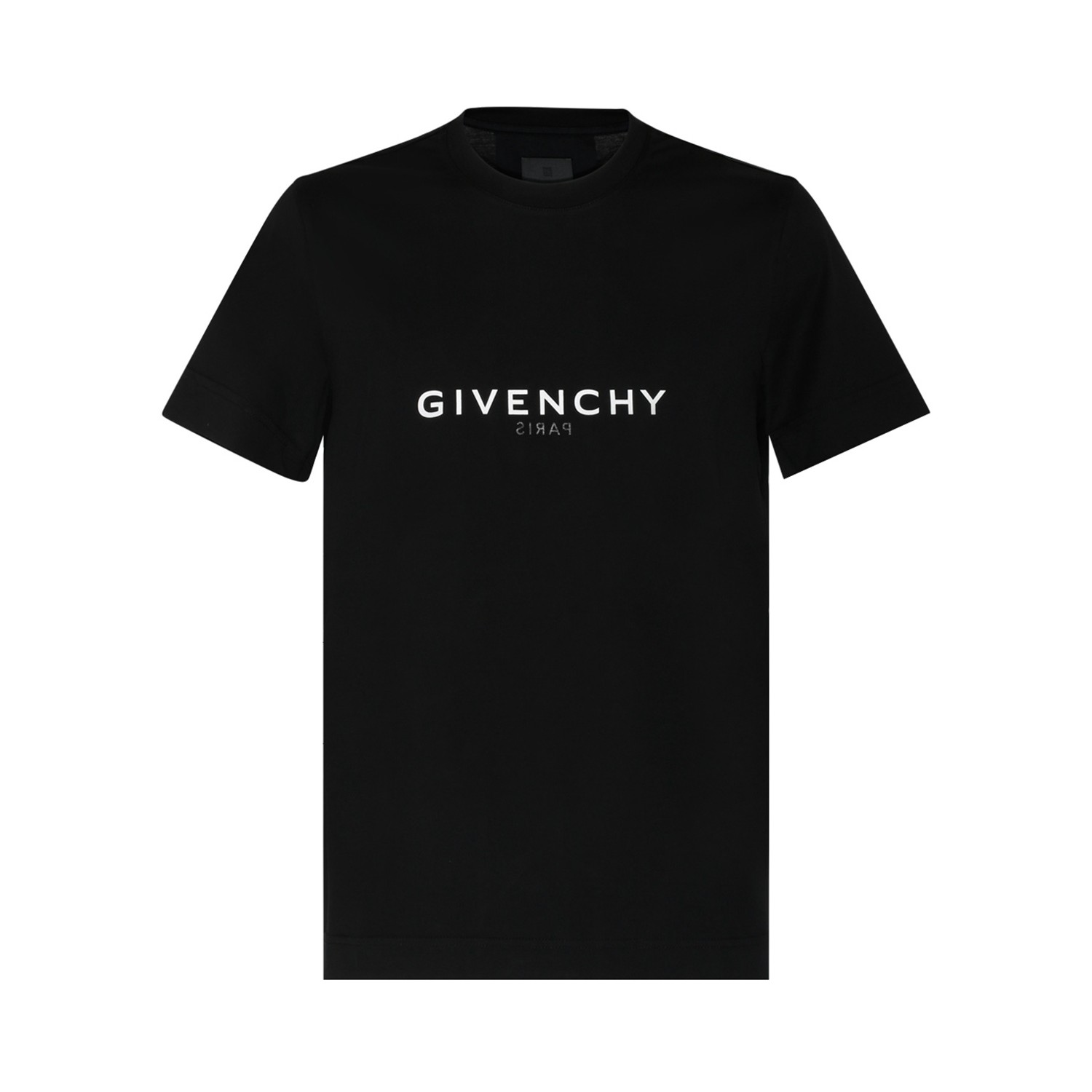 Givenchy Black Reverse Effect Logo Print T-Shirt. Black cotton t-shirt, reverse effect logo on the front and back, small white 4G logo print on the back. Short sleeves, crew neck, straight hem.