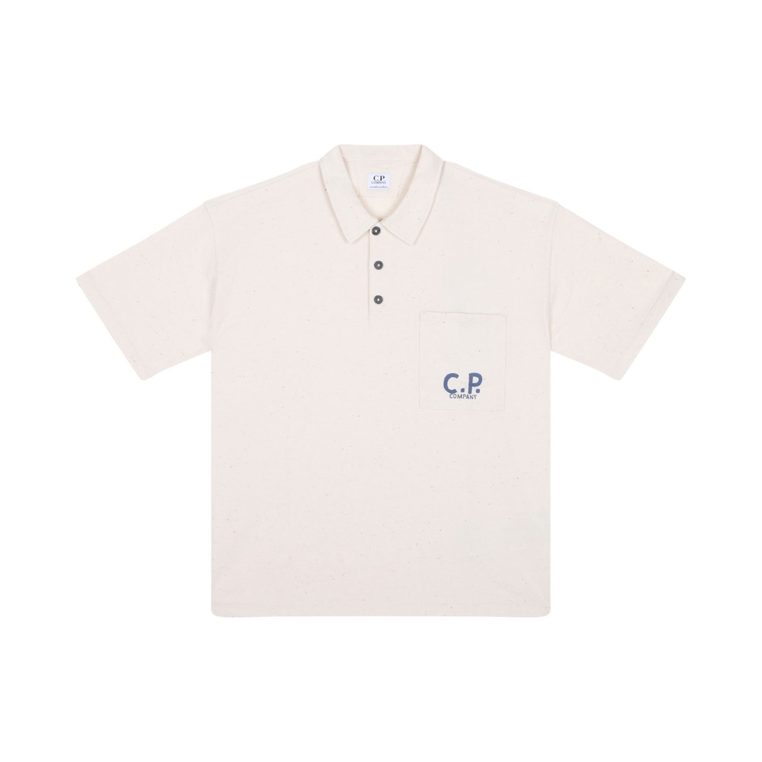 C.P. Company Kids Light Sand Polo Shirt. Light sand cotton polo shirt, classic collar, front button fasening, logo print to the front, front pocket, short sleeves.