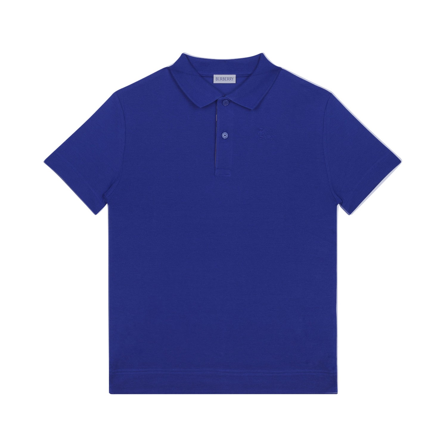 Burberry Kids Blue Polo Shirt. Blue cotton polo shirt with short front button fastening, short side slits, signature Equestrian Knight motif, high-low hem.