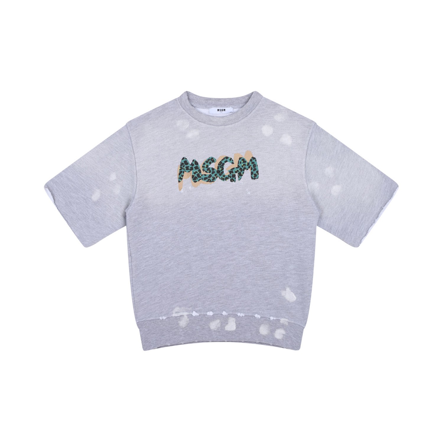 MSGM Kids Heather Grey Logo Print T-Shirt. Heather grey cotton t-shirt with logo print to the front, ribbed hem, French terry lining, distressed effect.