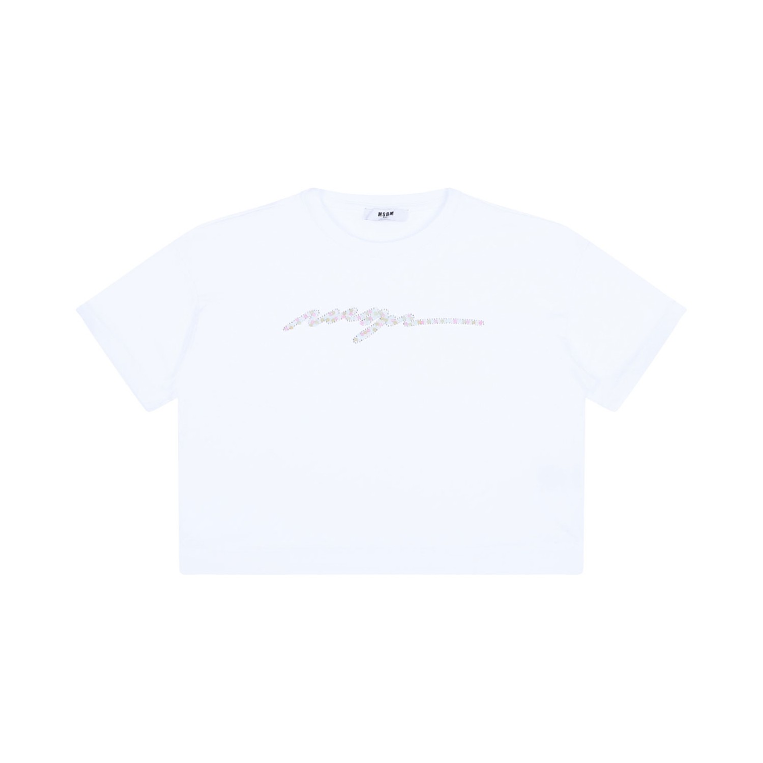 MSGM Kids White Logo Embellished T-Shirt. White cotton t-shirt with logo embellished, crew neck, short sleeves.