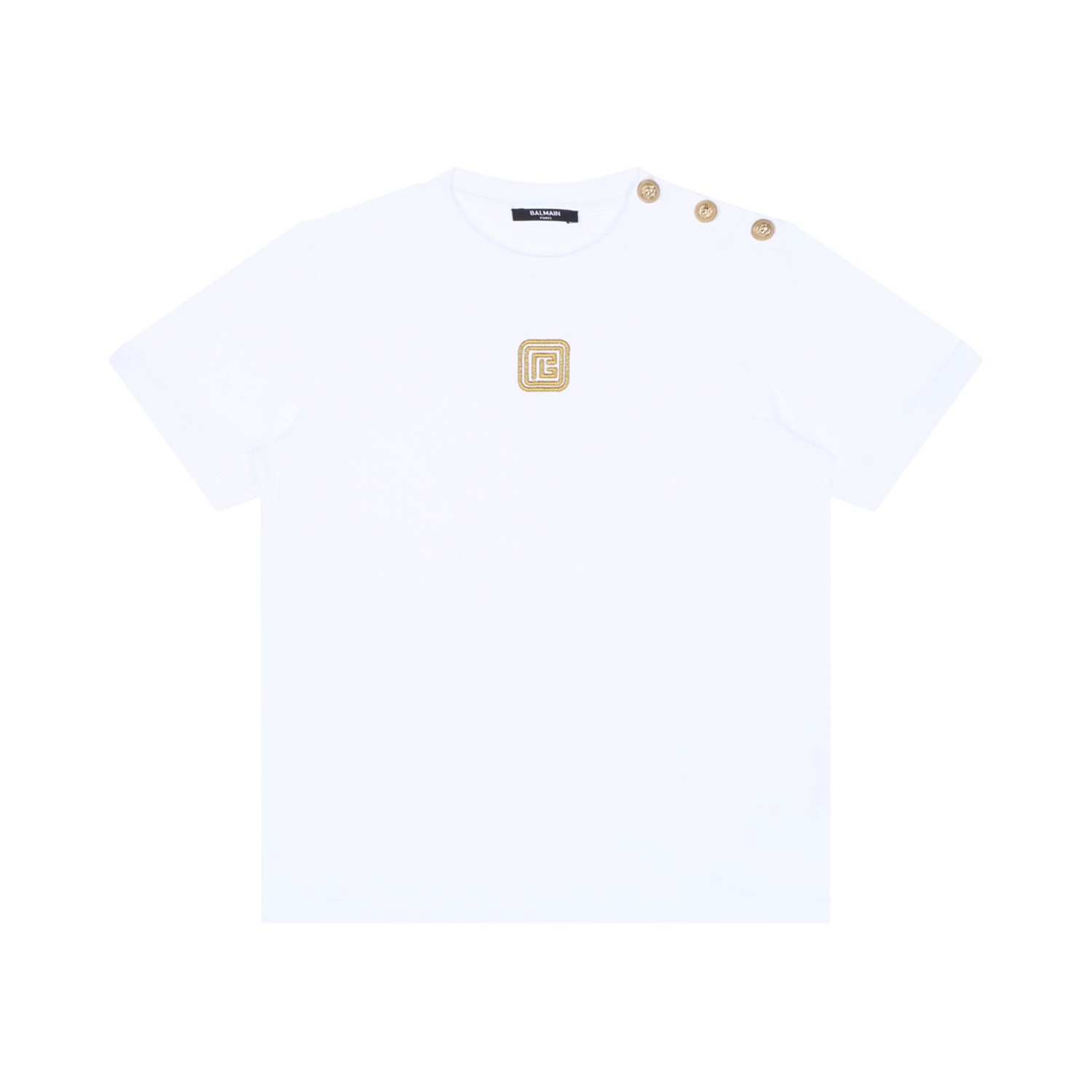 Balmain Kids White Logo Embroidered T-Shirt. White cotton t-shirt with logo embroidered to the front, crew neck, short sleeves and decorative button detailing.