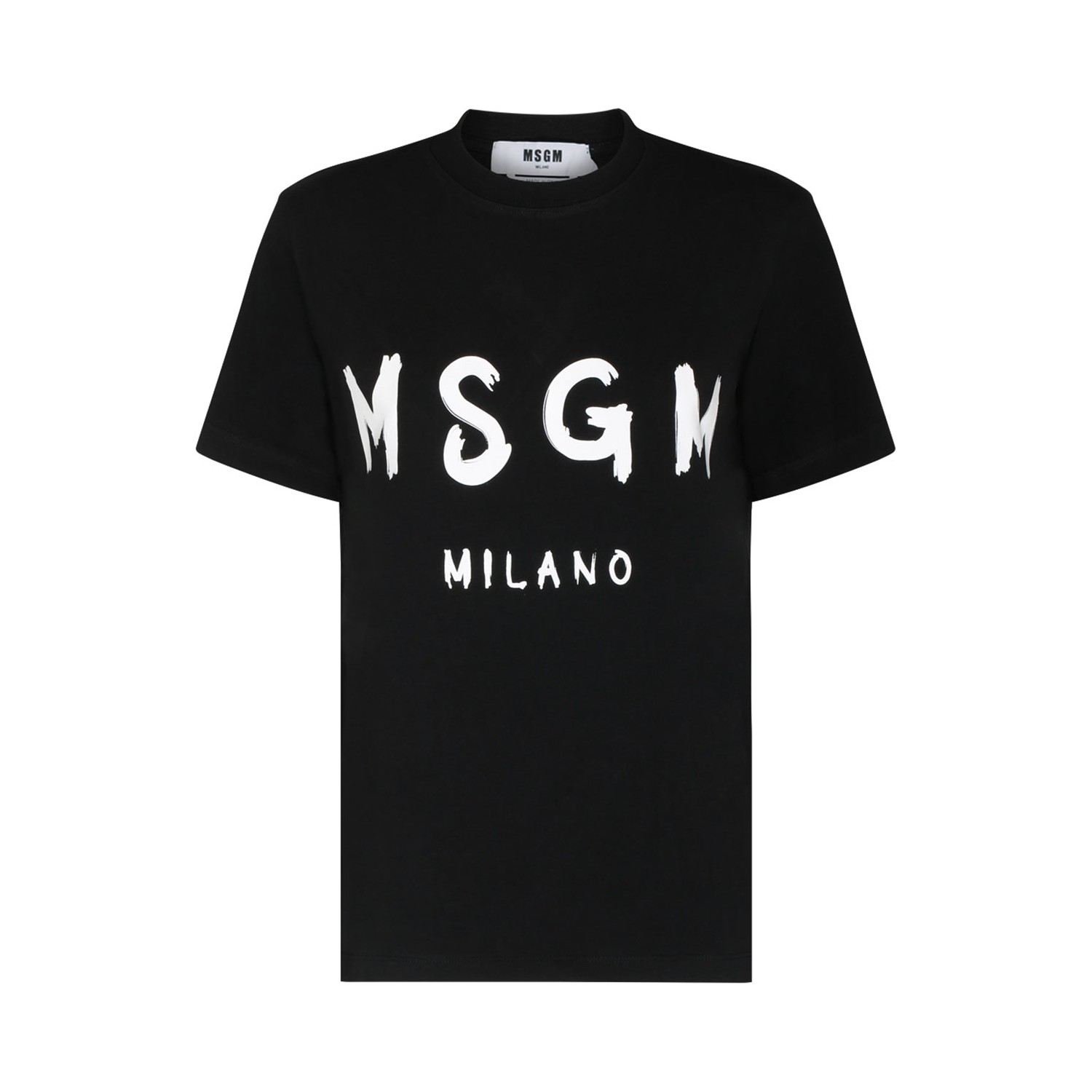 MSGM Black Logo Print T-Shirt. Black cotton t-shirt, white logo print to the front, jersey knit, short sleeves, crew neck, straight hem.