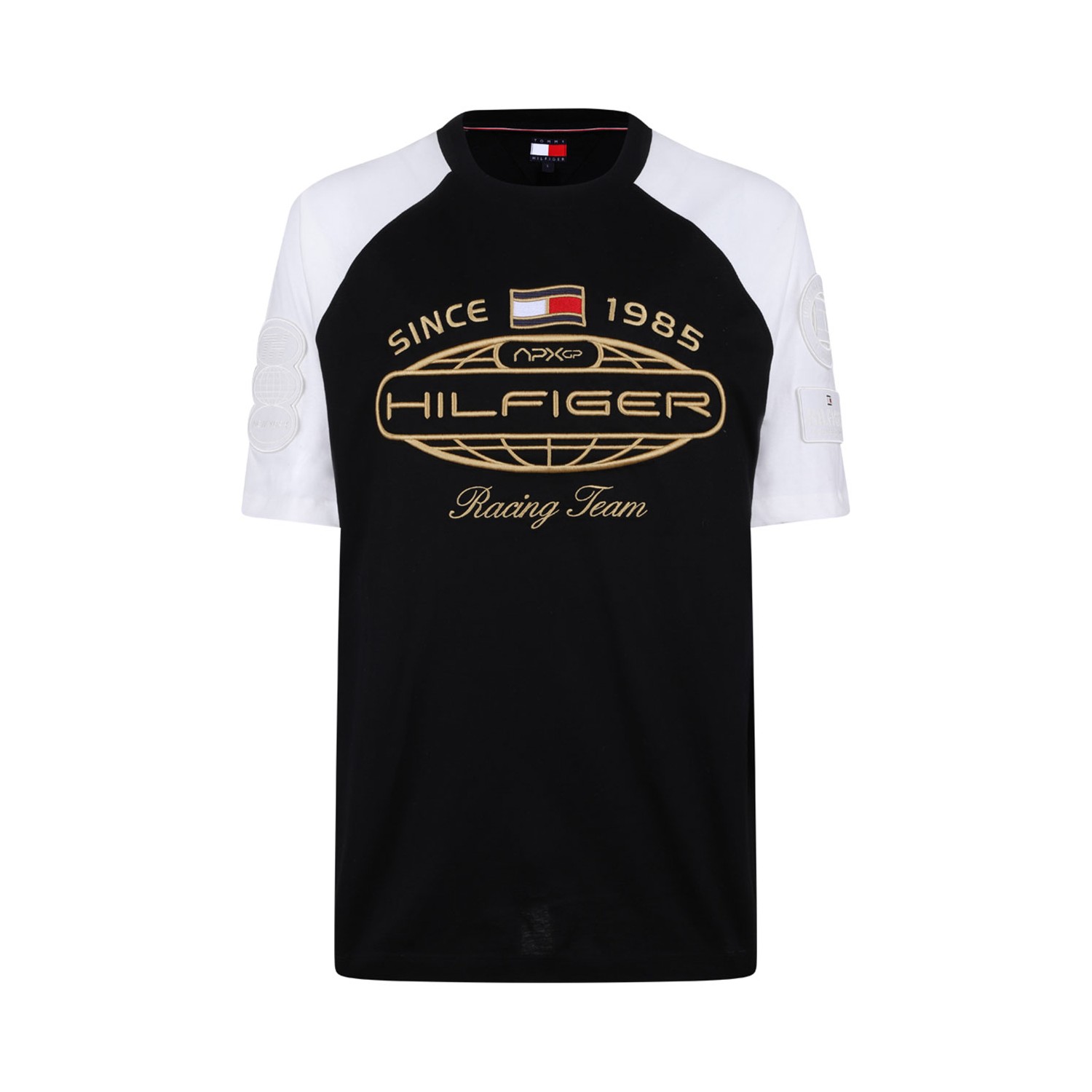 Tommy Hilfiger Black Logo Embroidered T-Shirt. Black cotton t-shirt with emrboidered logo to the front and to the sleeves. Crew neck and short sleeves.