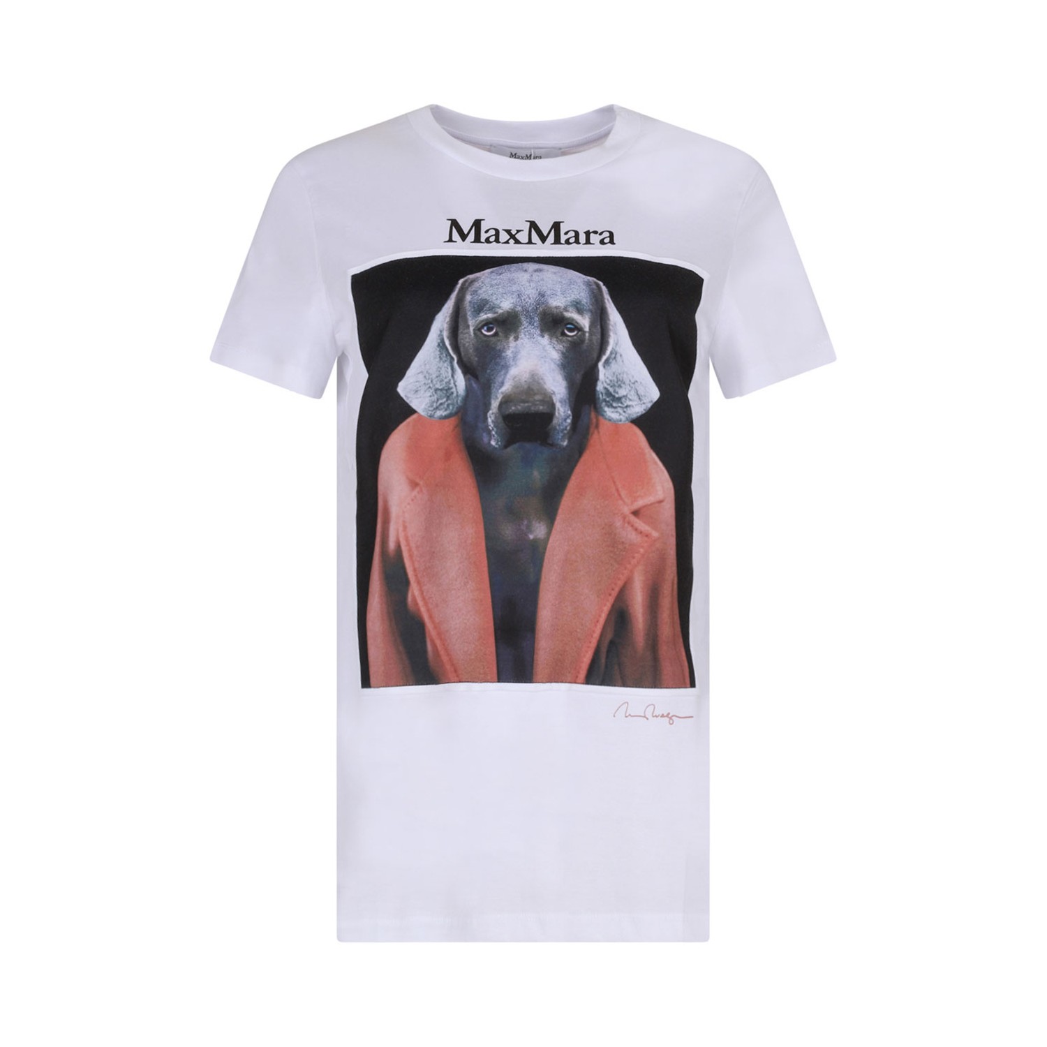 Max Mara White Dog Print T-Shirt. White cotton t-shirt, jersey texture, crew neck, short sleeves. Logo print at the chest, dog print, straight hem.