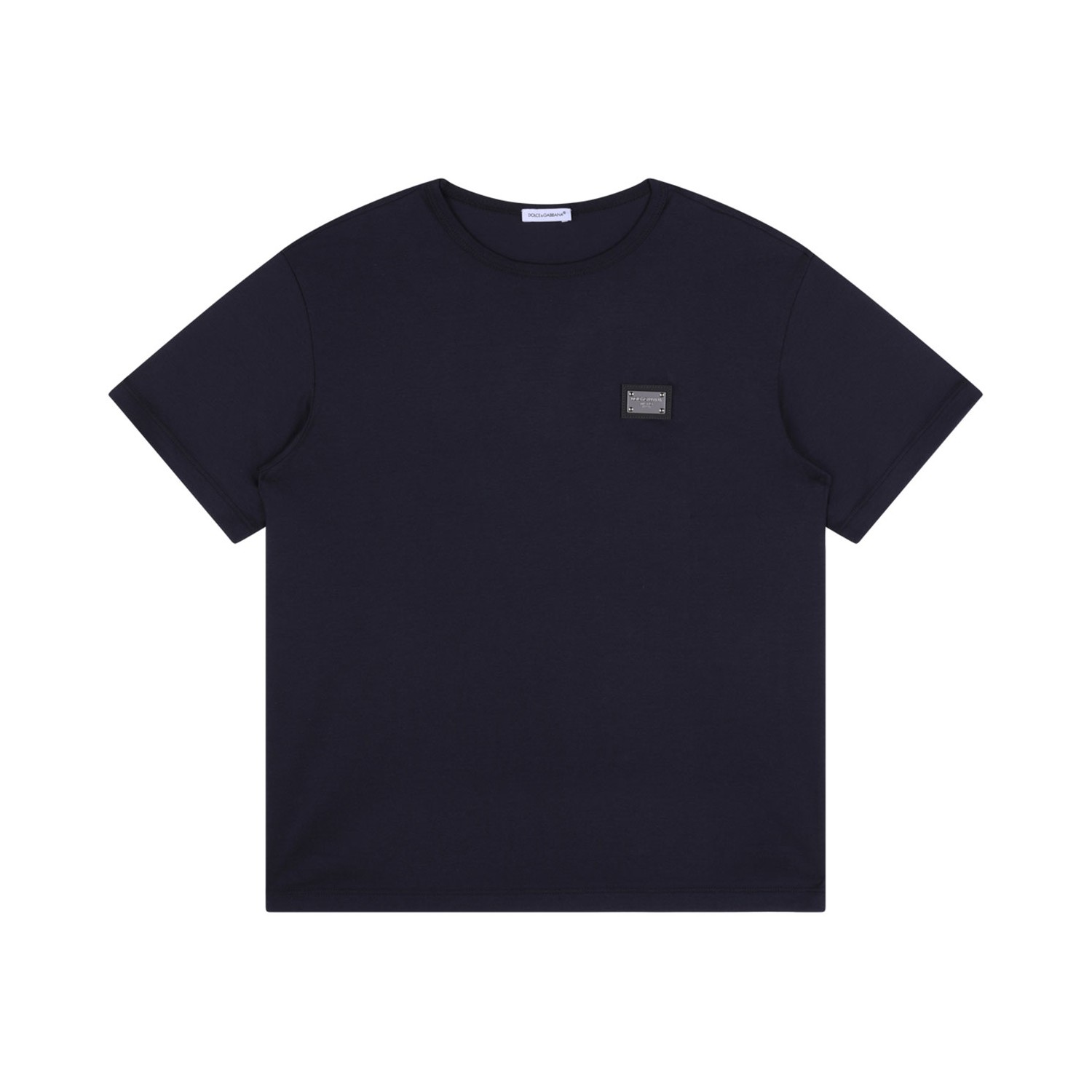 Dolce & Gabbana Kids Dark Blue Logo Plaque T-Shirt. Drak blue cotton t-shirt with rectangular logo plaque to the front, crew neck, short sleeves.