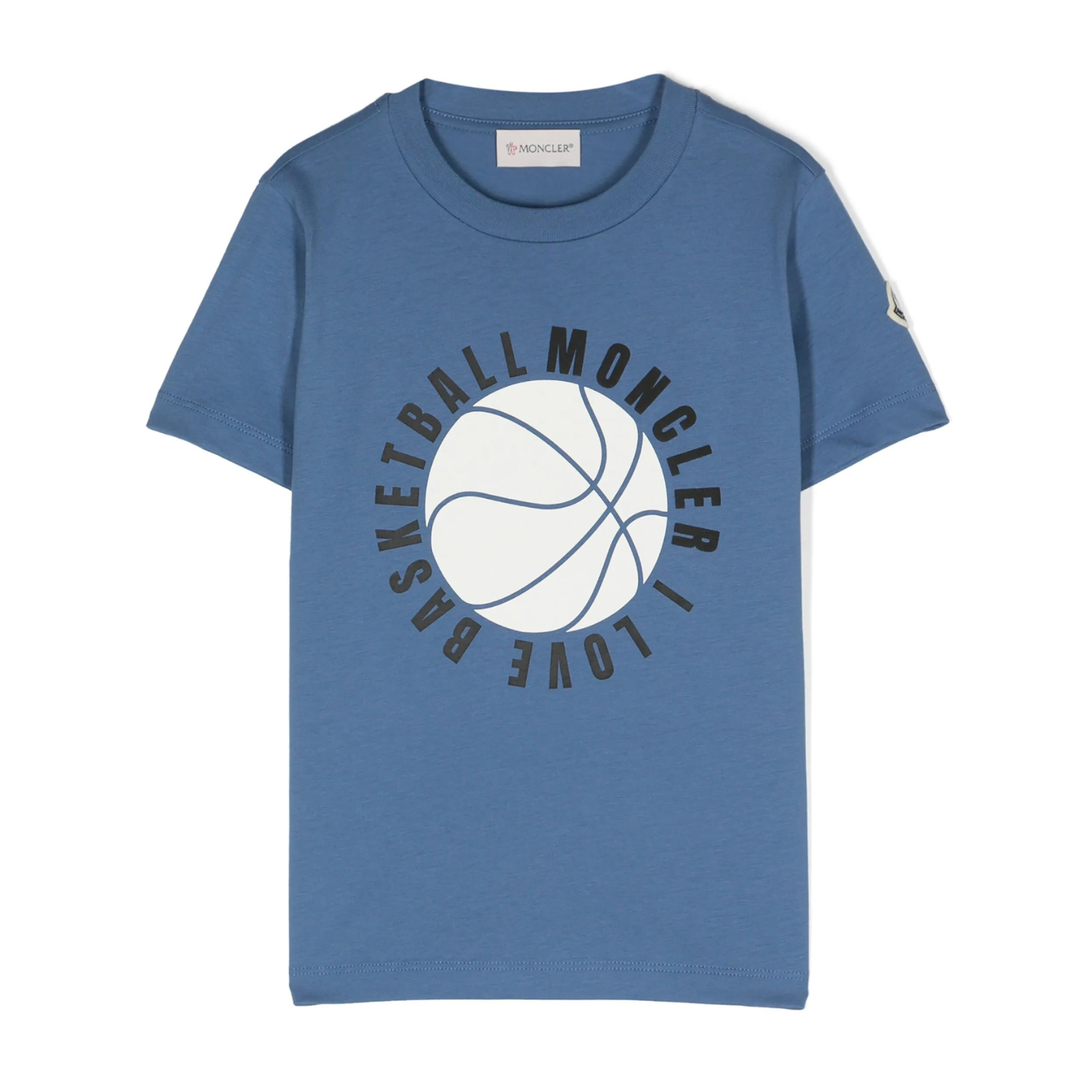 Moncler Kids Blue Basketball Print T-Shirt. Blue cotton t-shirt, round neck, basketball print to the front. Short sleeves, applique logo at the sleeve, straight hem.
