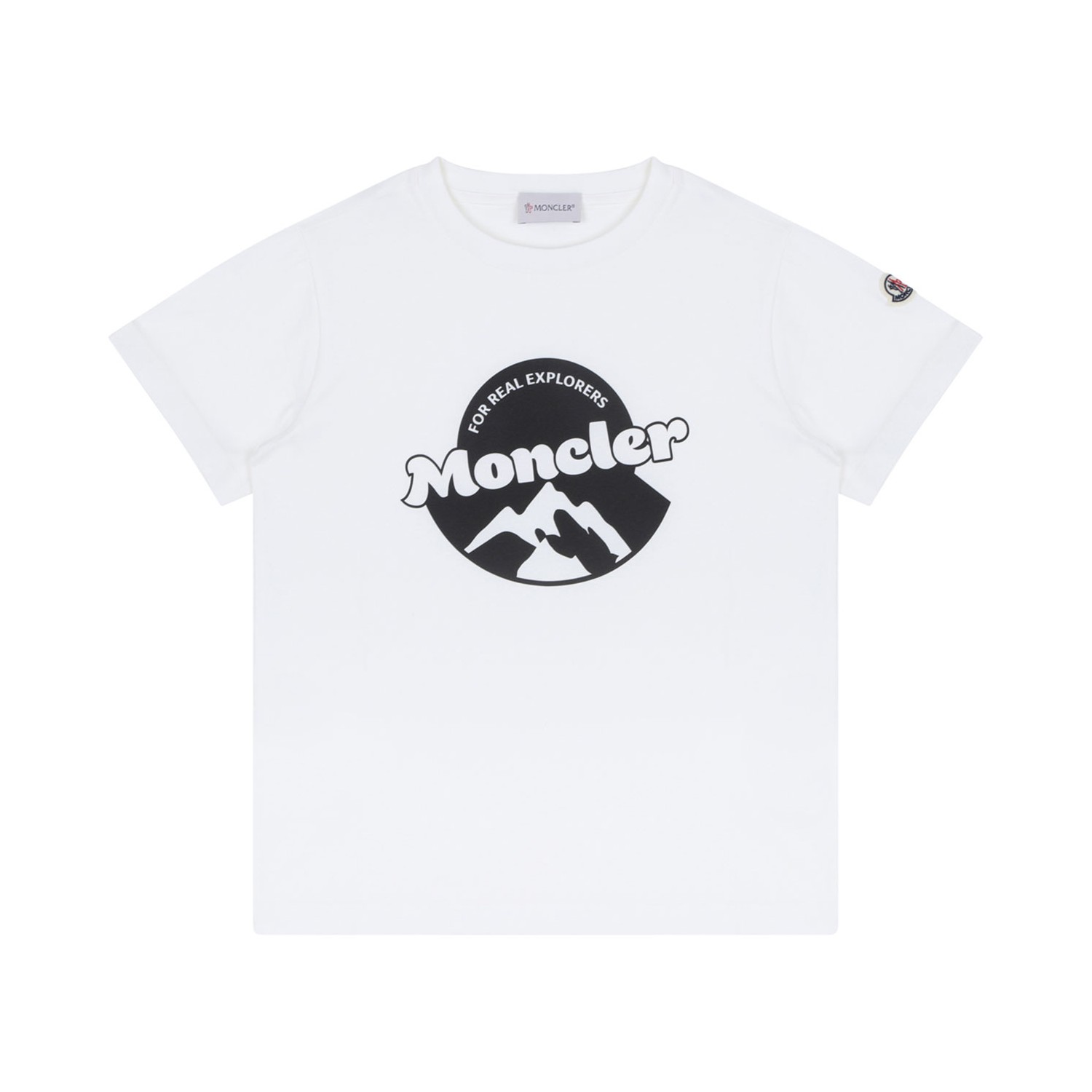 Moncler Kids White Logo Print T-Shirt. White cotton t-shirt with logo print to the front, crew neck, short sleeves, logo patch to the sleeve.