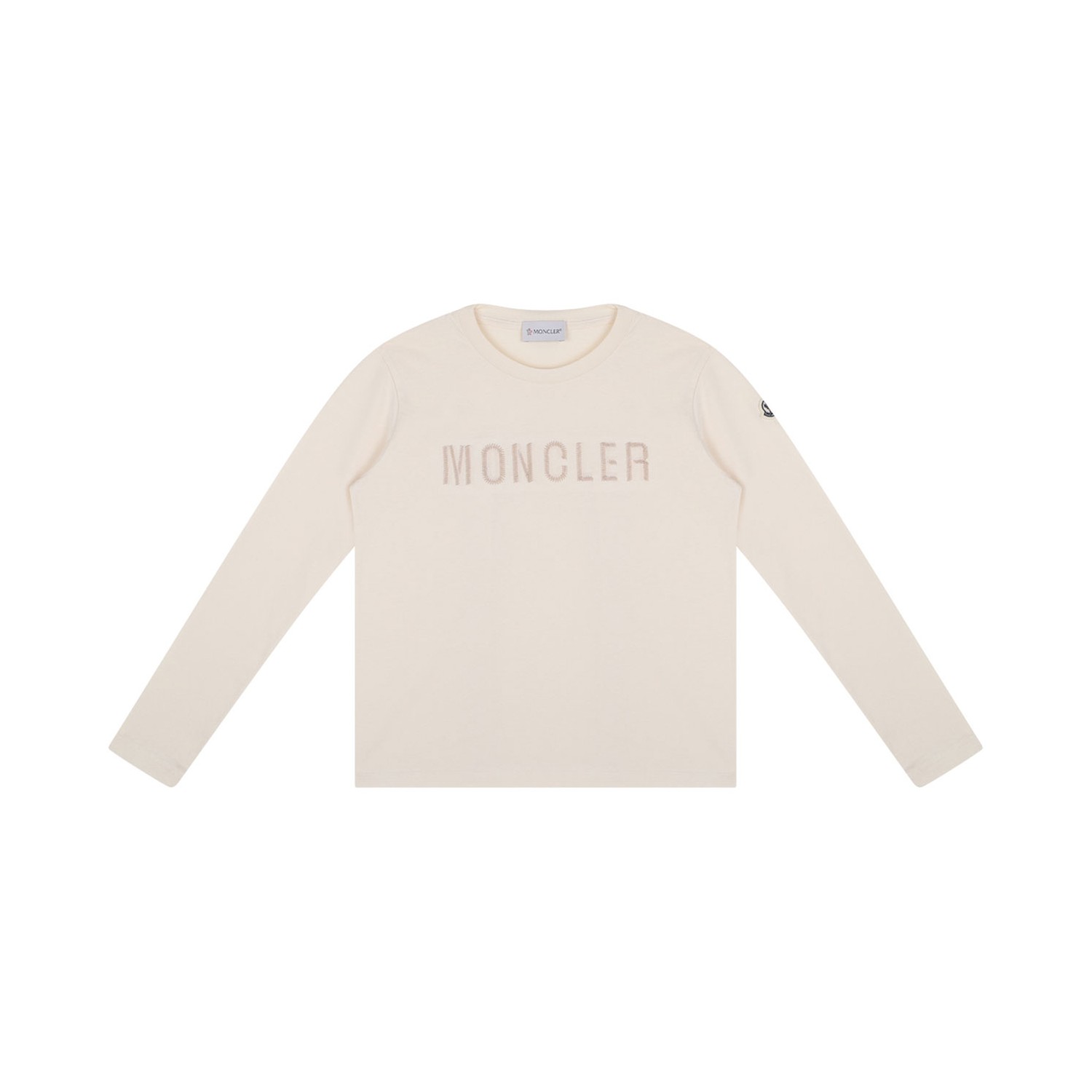 Moncler Kids Beige Logo Embroidered T-Shirt. Beige soft jersey t-shirt, long sleeves, embroidered logo to the front, logo patch to the sleeve, crew neck.