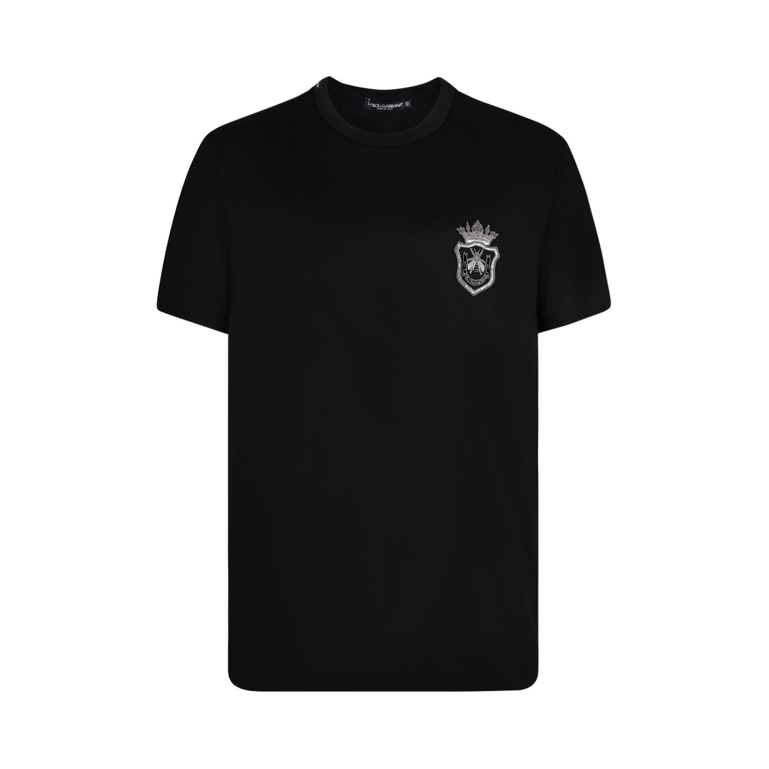 Dolce & Gabbana Black T-Shirt. Black cotton jersey t-shirt. Classic fit, stick logo label on the neck, knitted neck, sleeves and bottom of the garment, short sleeves, with heraldic crest patch.