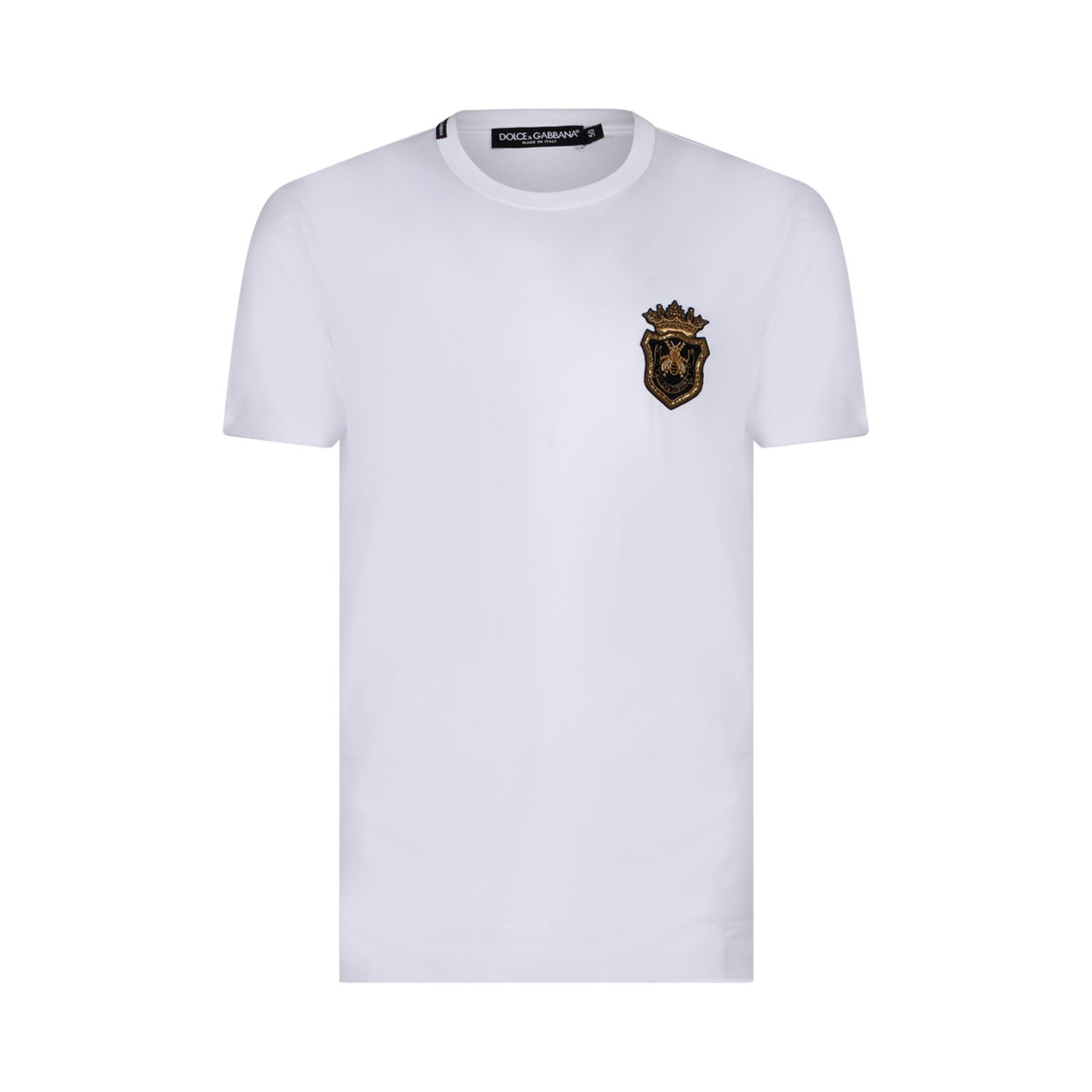 Dolce & Gabbana White T-Shirt. White cotton jersey t-shirt. Classic fit, stick logo label on the neck, knitted neck, sleeves and bottom of the garment, short sleeves, with heraldic crest patch.