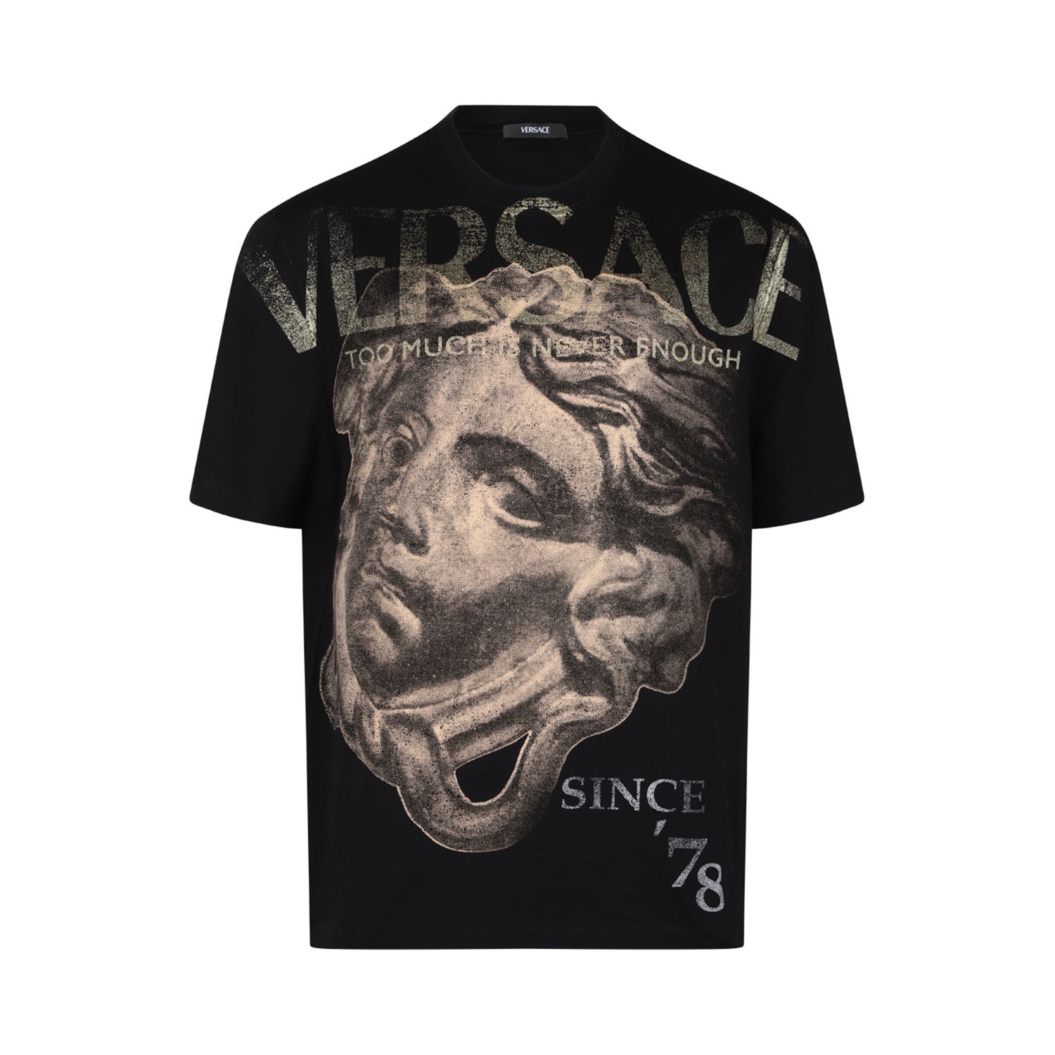 Versace Black Medusa Print T-Shirt. Black cotton t-shirt with logo print to the front, Medusa graphic print to the front. Crew neck and short sleeves.
