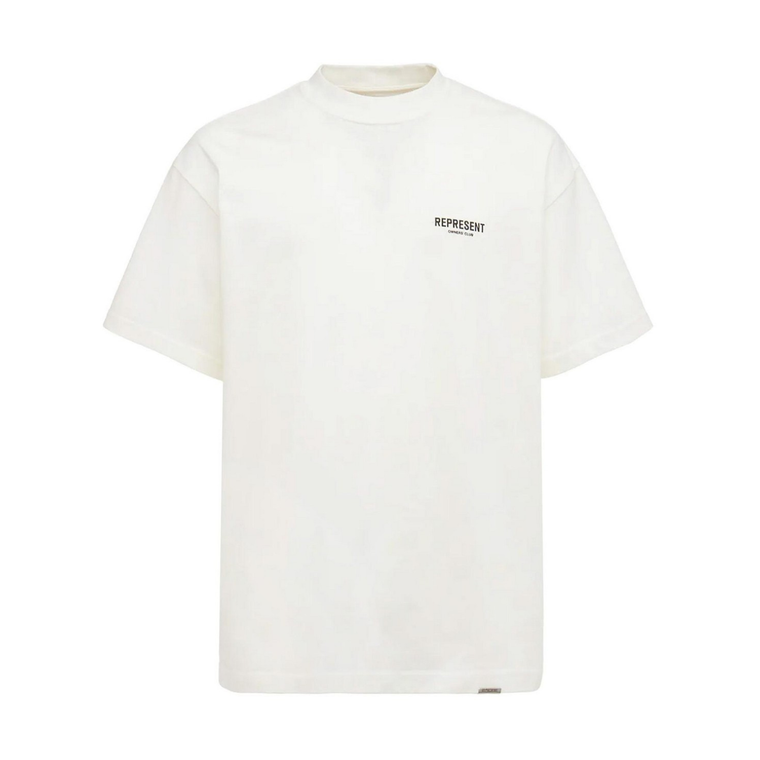 Represent White Owners Club T-Shirt. White cotton t-shirt with lightweight jersey, crew neck, logo print at the chest, graphic print to the rear and straight hem.