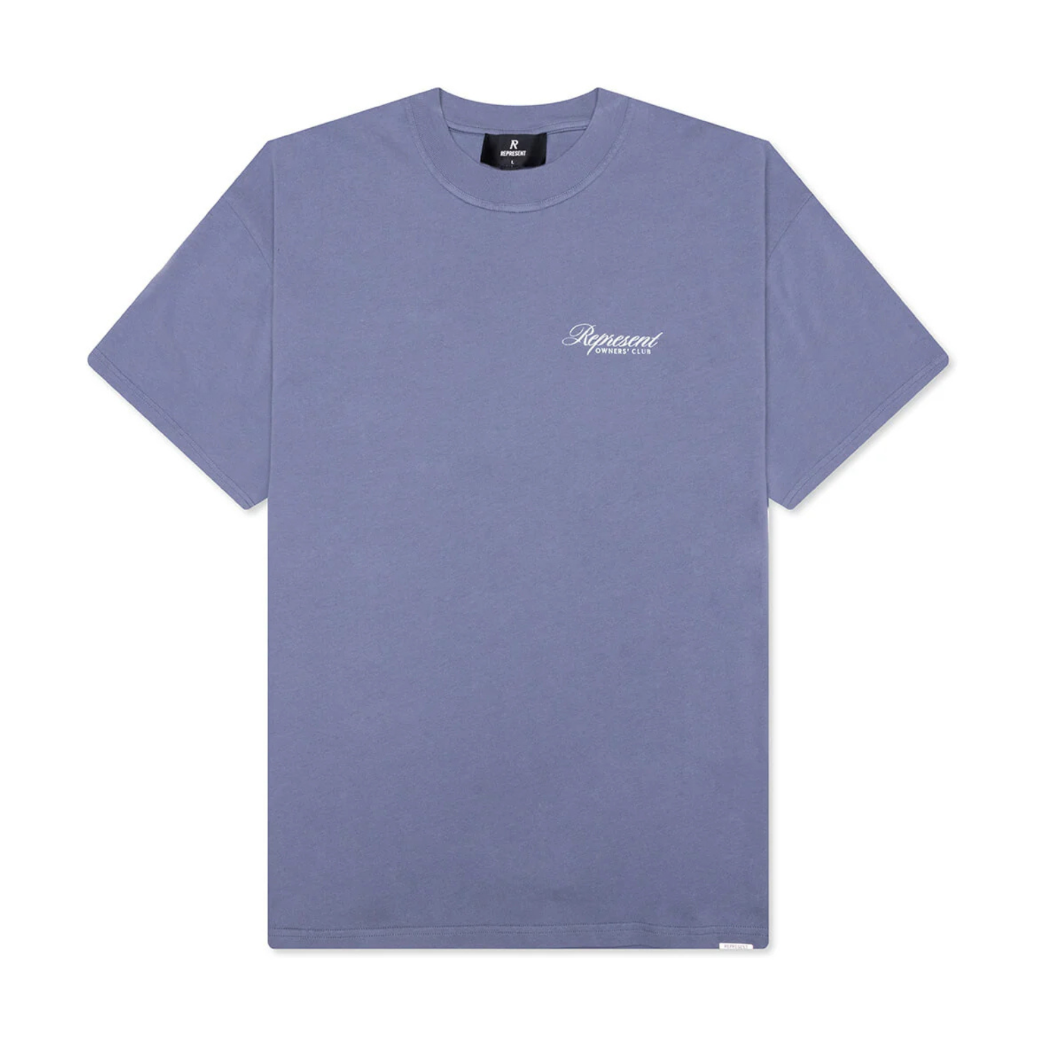 Represent Dusty Blue Owners Club T-Shirt. Dusty blue cotton t-shirt with lightweight jersey, crew neck, logo print at the chest, graphic print to the rear and straight hem.