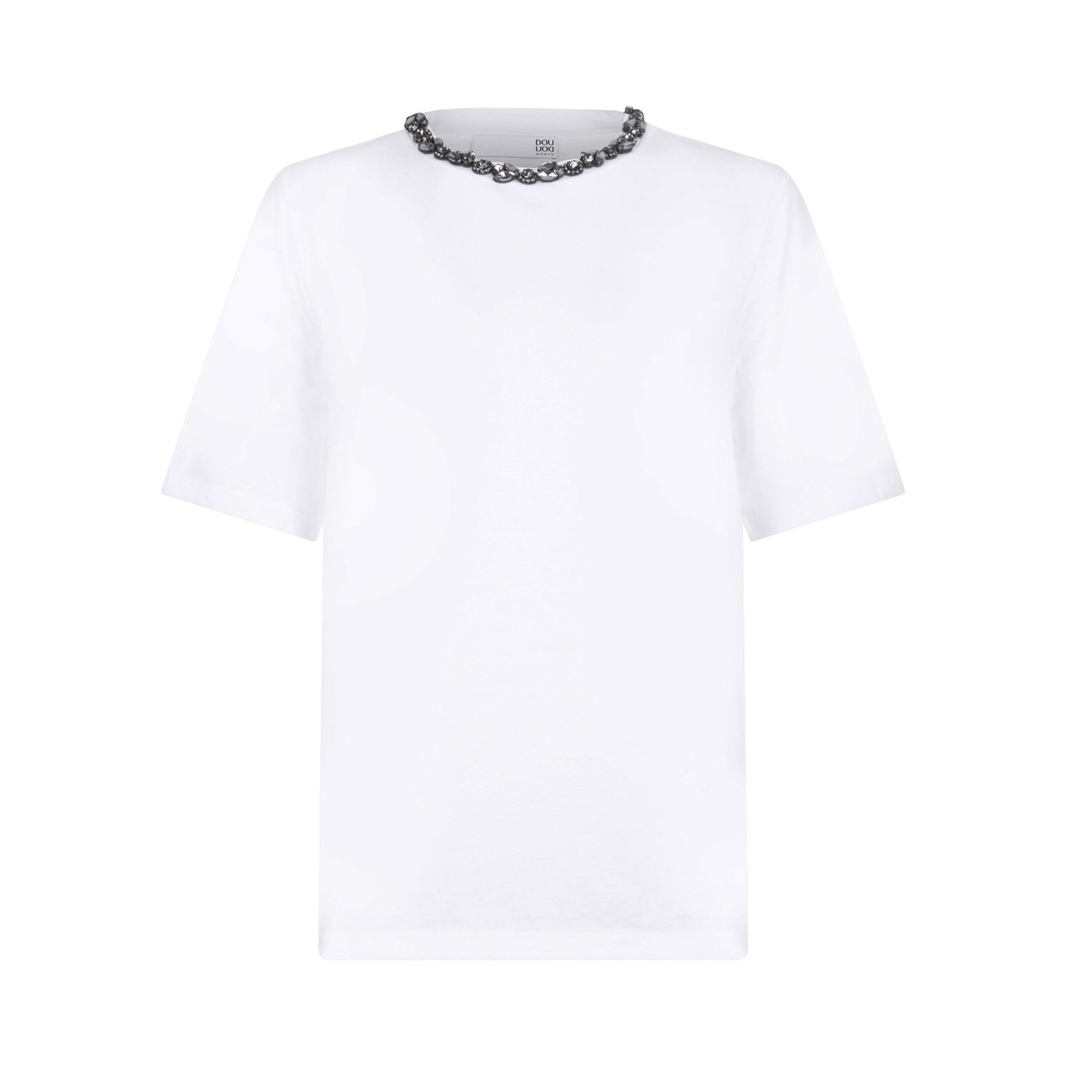 Douuod White Crystal Embellished T-Shirt. White t-shirt with crew neck, crystal embellished and short sleeves.
