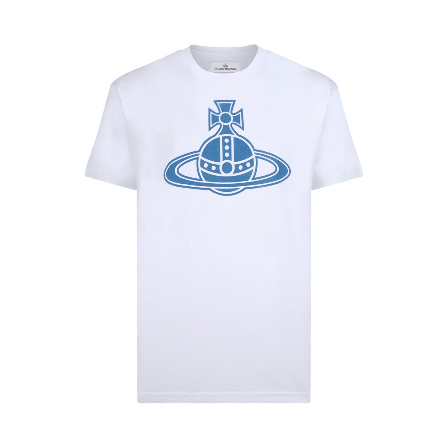 Vivienne Westwood White Logo Print T-Shirt. White cotton t-shirt with light blue orb logo print to the front, crew neck and short sleeves.