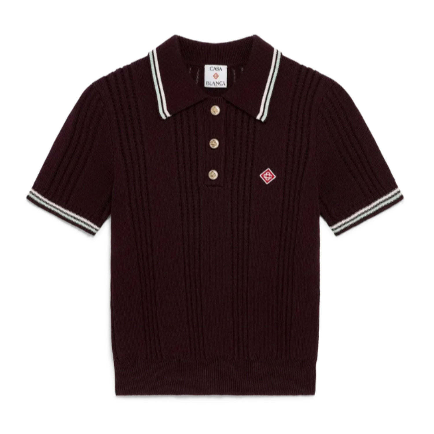 Casablanca Burgundy Cotton Knit Short Sleeve Polo. The cotton knit short-sleeve polo is a classic design featuring the house's signature diamond logo, crafted from cotton fabric. Completed with a rib collar and cuffs, an elasticised hem, signature gold rim pearl buttons, and stripe edge detail on the collar and cuffs.