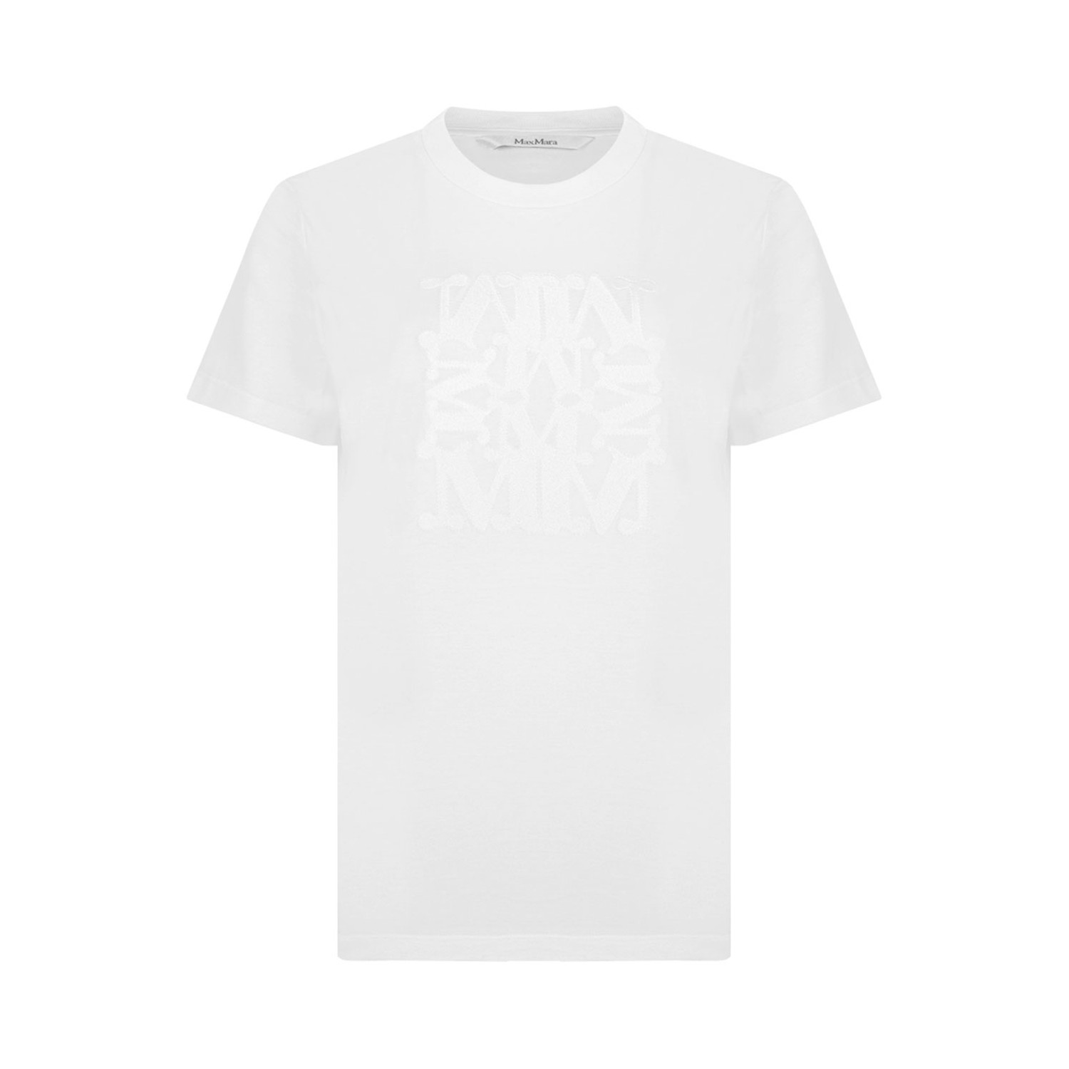 Max Mara White Cotton Logo Embroidered T-Shirt. White cotton basic T-shirt with MaxMarabesque thread design in the center of the front. Straight line, ribbed crew neck, short sleeves and straight bottom.