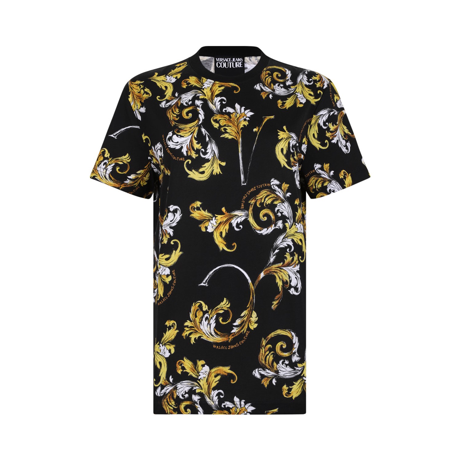 Versace Jeans Couture Black Baroque Print T-Shirt. Black cotton t-shirt with all-over print, crew neck, short sleeves, straight hem.