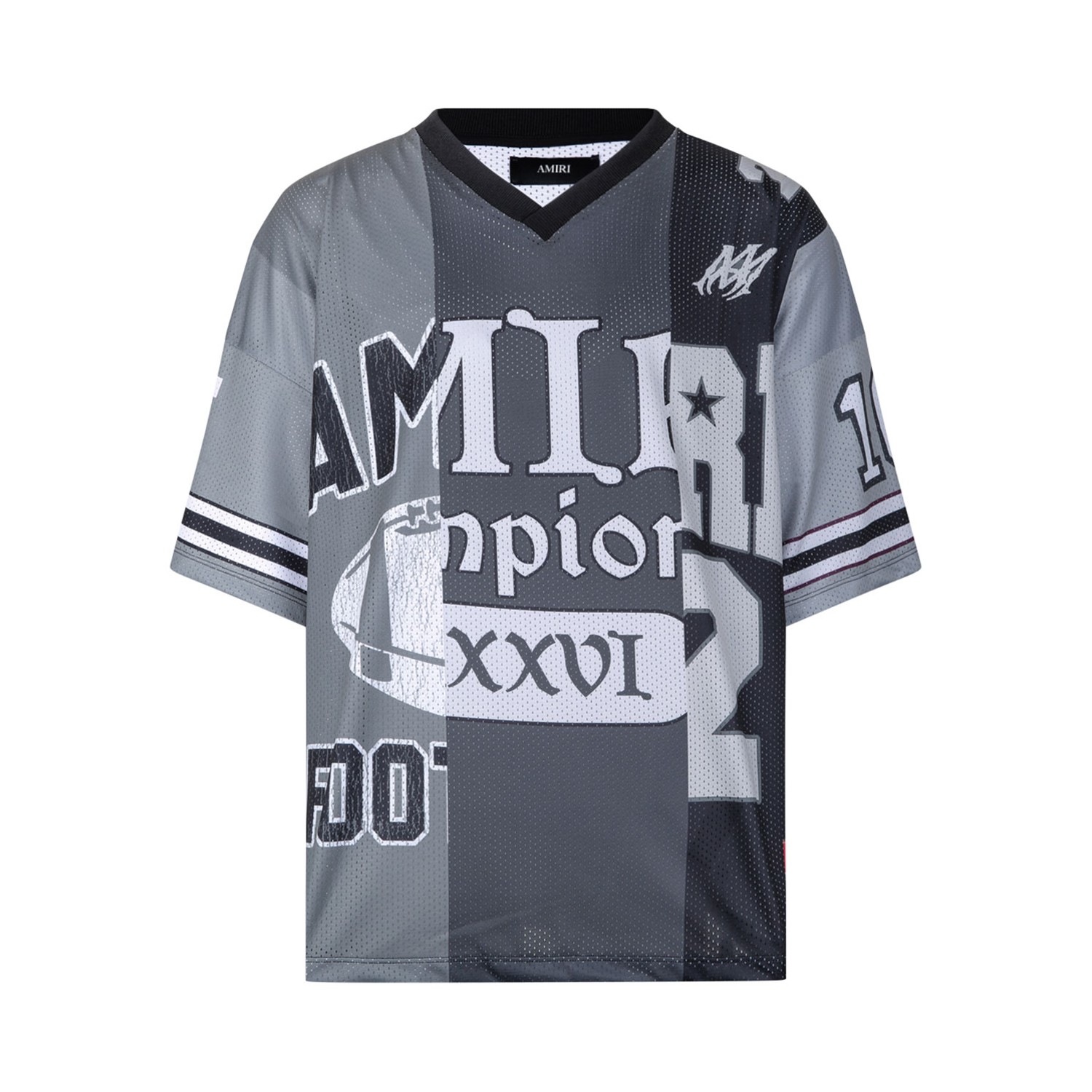 Amiri Spliced Oversized T-Shirt. Spliced oversized T-shirt with a bold fusion of sport and luxury. It features a striking spliced design that blends contrasting panels, while breathable mesh fabric gives it an authentic athletic texture and effortless drape.