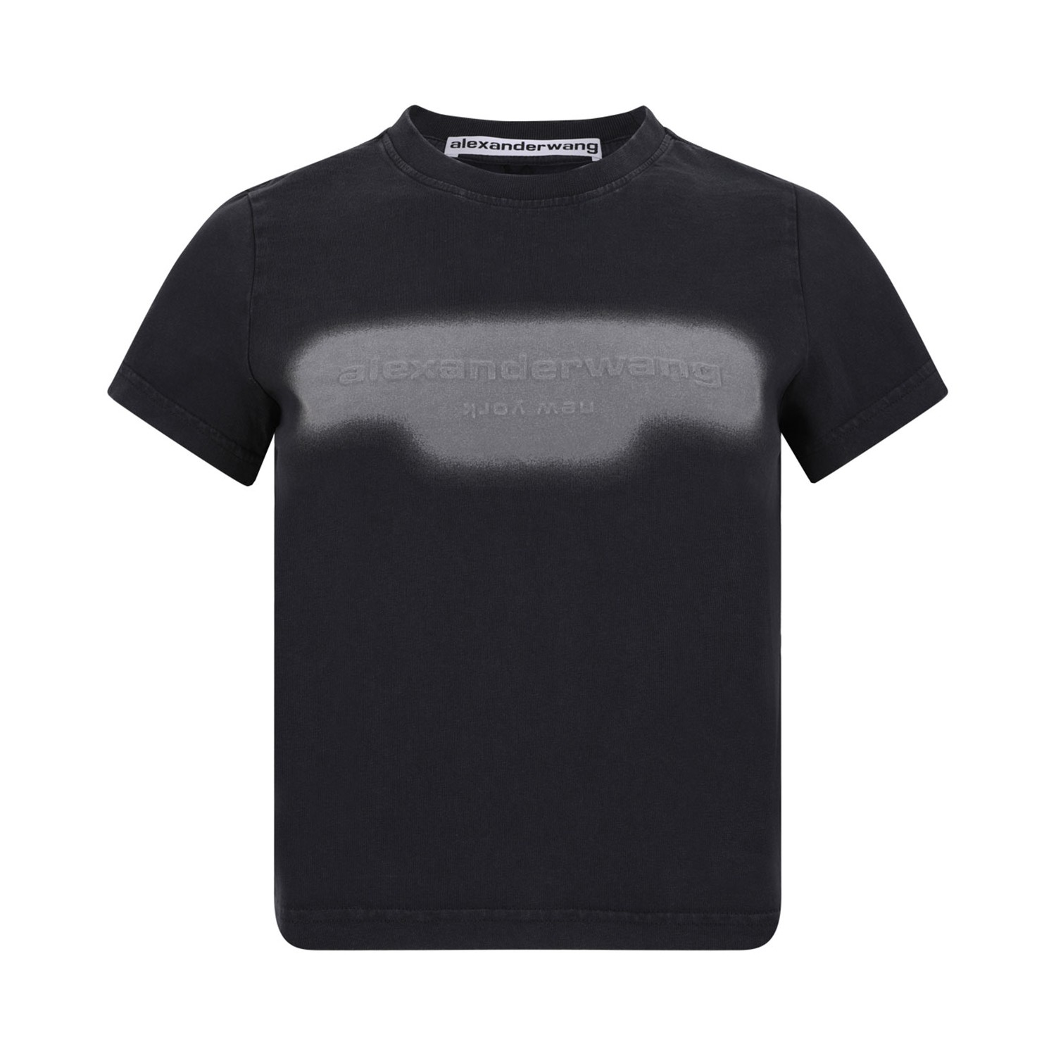 Alexander Wang Washed Black Reflective Halo Logo Print T-Shirt. Washed black cotton t-shirt with short-slees, shrunk-effect. Featuring a ribbed crew neck and a raised logo embellished with a reflective halo print on the chest.