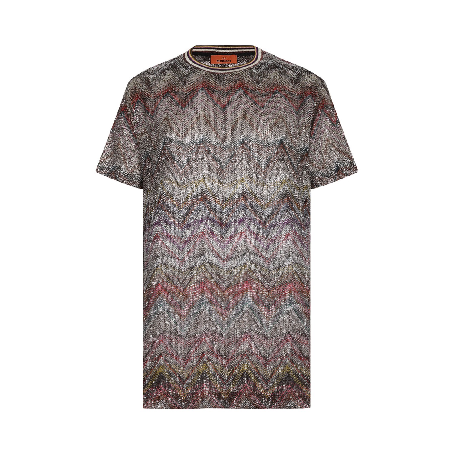 Missoni Multicolour Short Sleeve T-Shirt With Zigzag and Sequins. Multicolour short-sleeved t-shirt with caperdoni loom knit, zigzag pattern, viscose blend, lame threads and sequins.