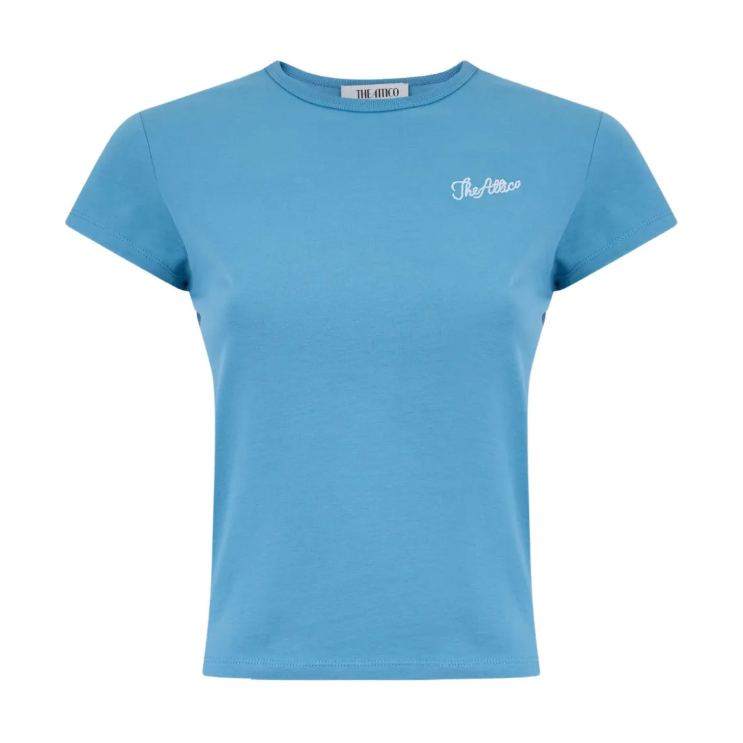 The Attico Light Blue Logo Embroidered T-Shirt. Light blue cotton t-shirt with short sleeves, crew neck, embroidered logo at the chest and straight hem.