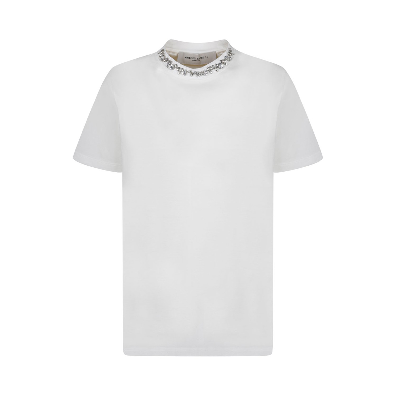 Golden Goose White Crystals Details T-Shirt. White cotton t-shirt, Cabochon crystals applied on the neck, double gold star on the back, short sleeves.