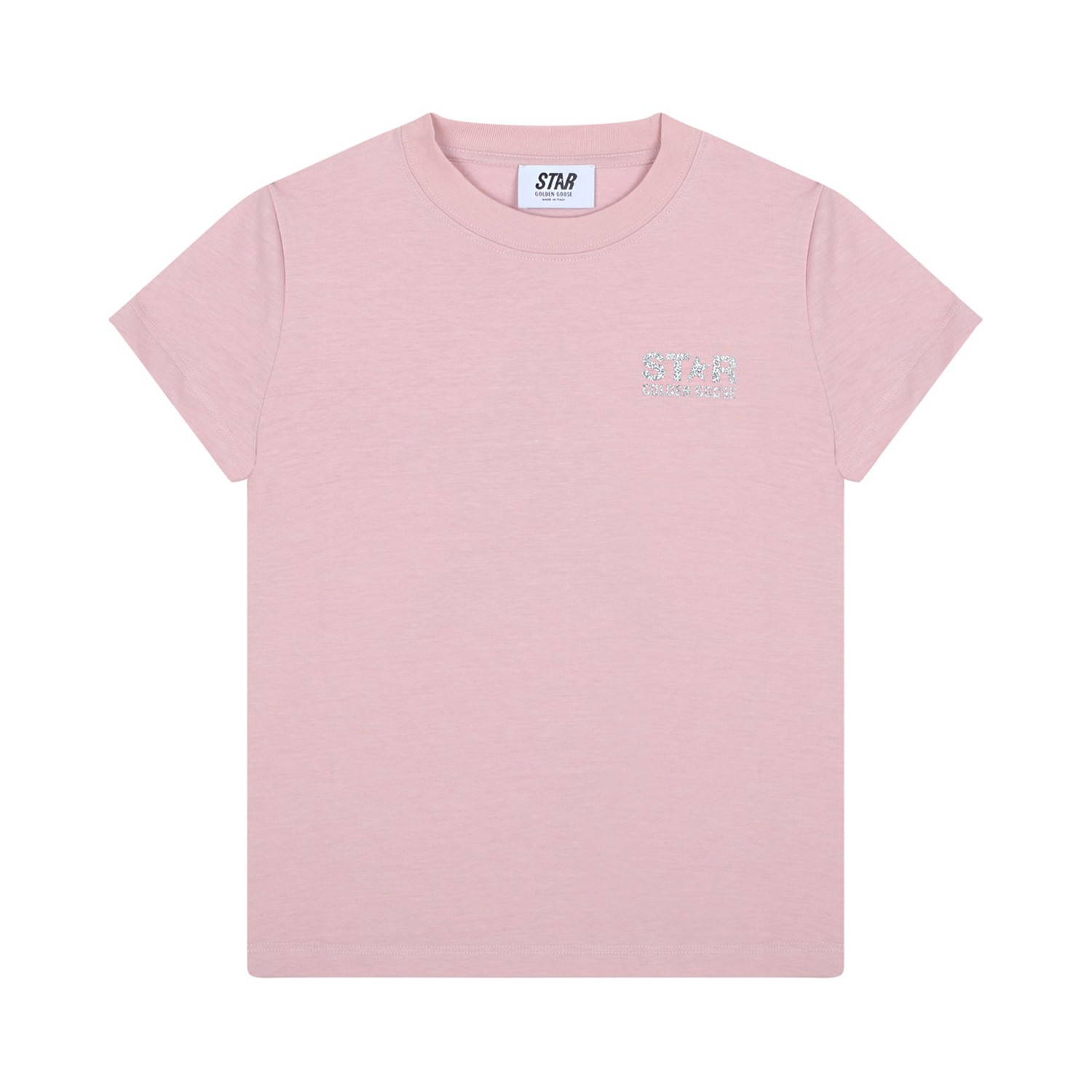 Golden Goose Kids Pink Star Print T-Shirt. Pink cotton t-shirt, logo print at the chest, star print to the rear, glitter detailing, crew neck, short sleeves.
