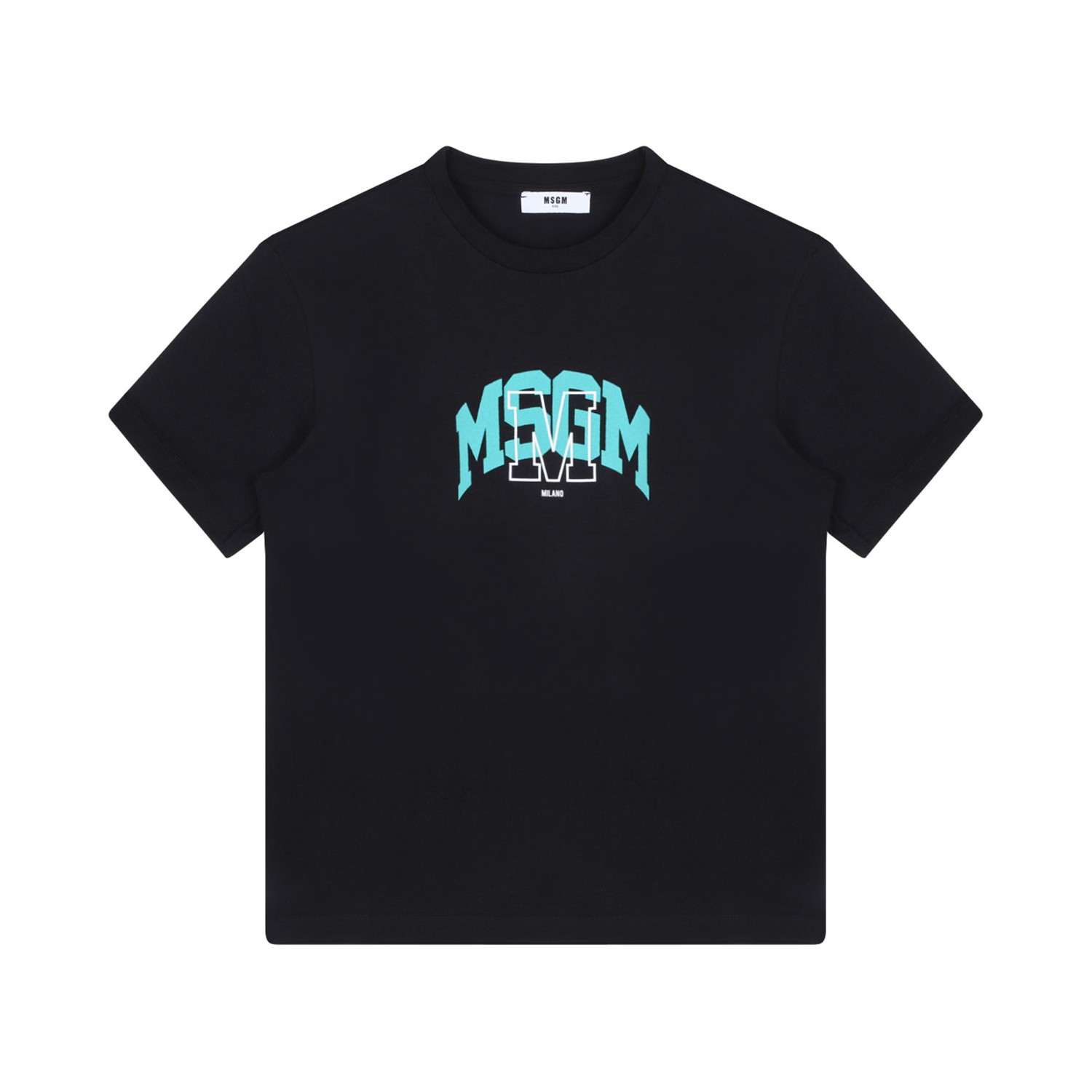 MSGM Kids Black Logo Print T-Shirt. Black cotton t-shirt with logo print to the front, crew neck, short sleeves.