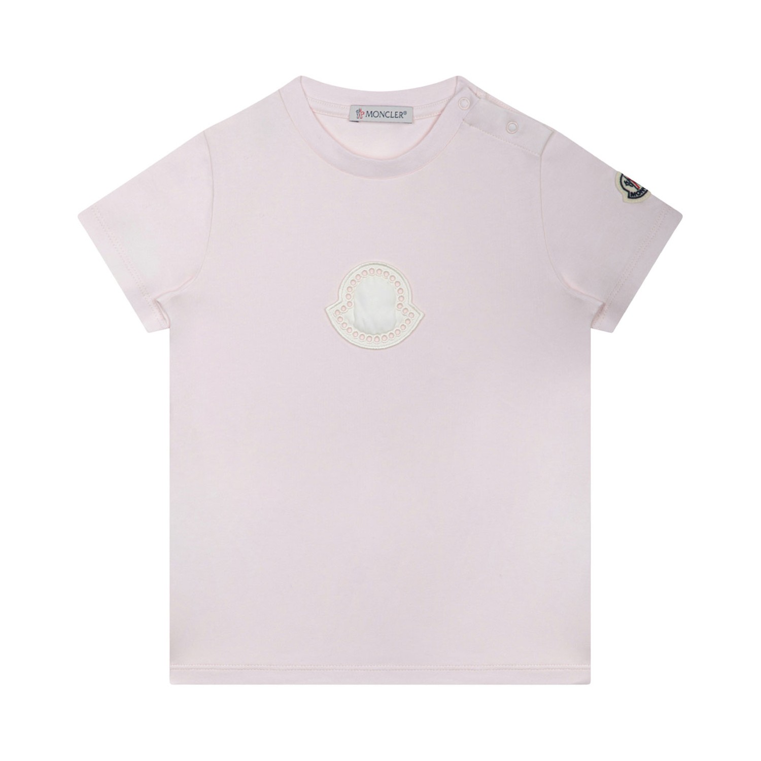 Moncler Kids Pink T-Shirt. Pink cotton t-shirt, short sleeves, crew neck. Ribbed hem and sleevs, white logo on the front and logo patch on the sleeve.
