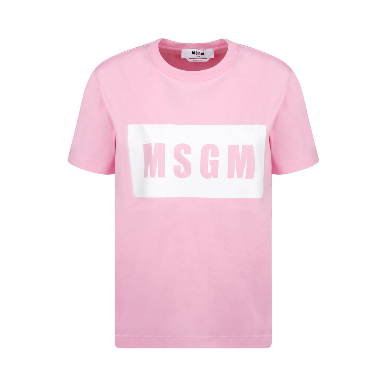 MSGM Pink Logo Print T-Shirt. Pink cotton t-shirt, logo print to the front, round neck, short sleeves and straight hem.