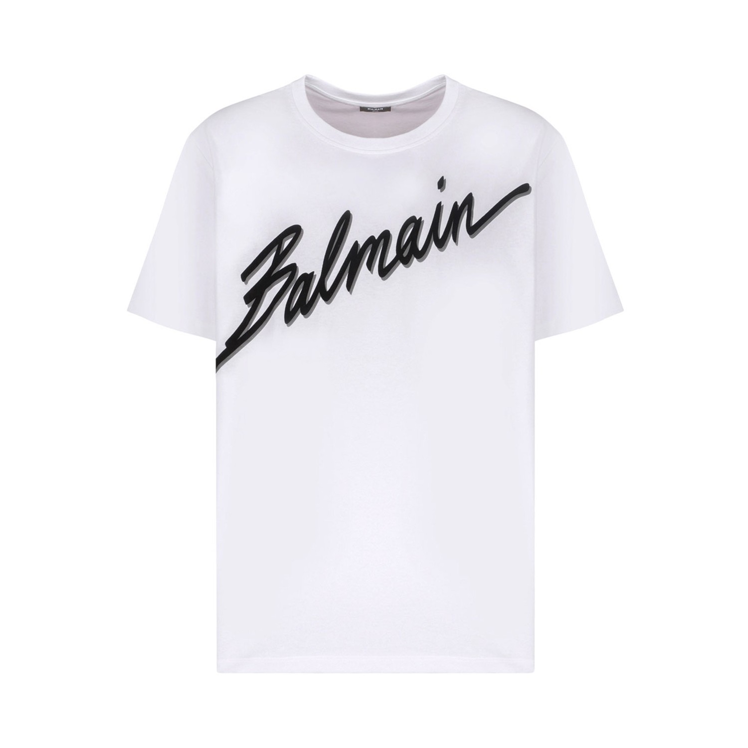 Balmain White Logo Print T-Shirt. White cotton t-shirt, logo print to the front, crew neck, short sleeves.