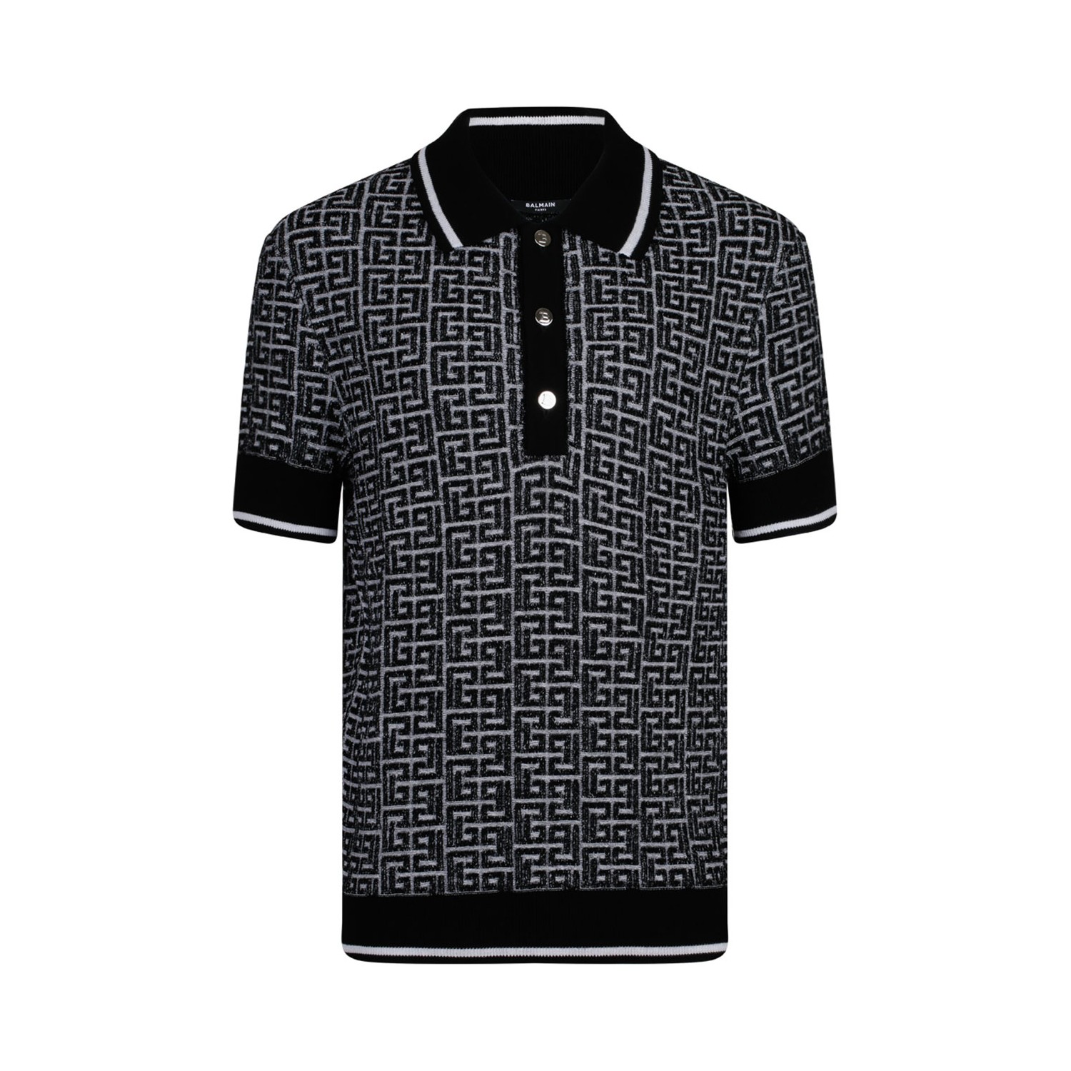 Balmain Black Labyrinth Knitted Polo Shirt. Black merino wool blend polo shirt, knitted construction, front button placket, short sleeves. Patterned jacquard and straight hem.