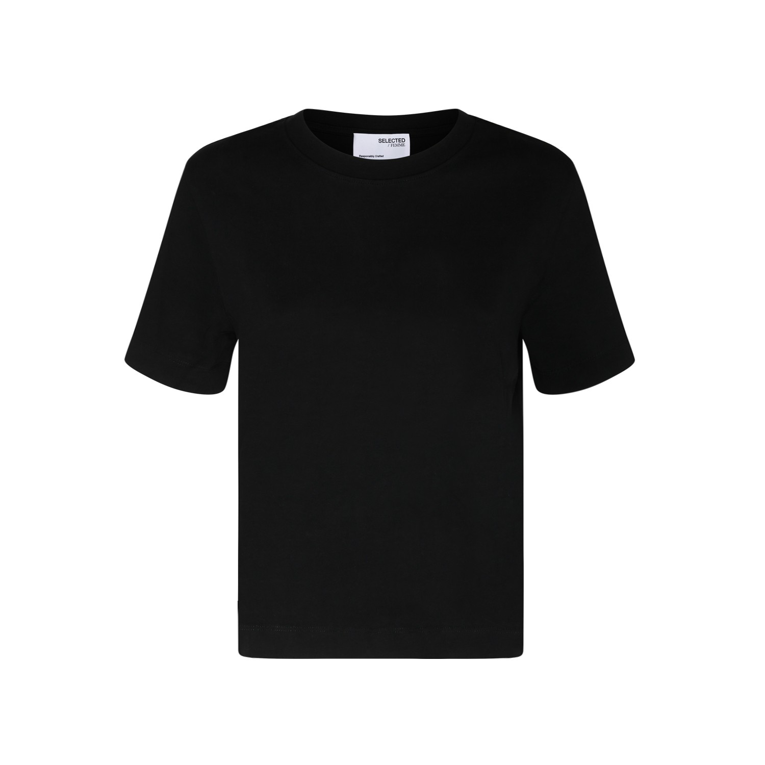 Selected Black Cotton T-Shirt. Black cotton t-shirt, dropped shoulders, short sleeves, ribbed round neck.