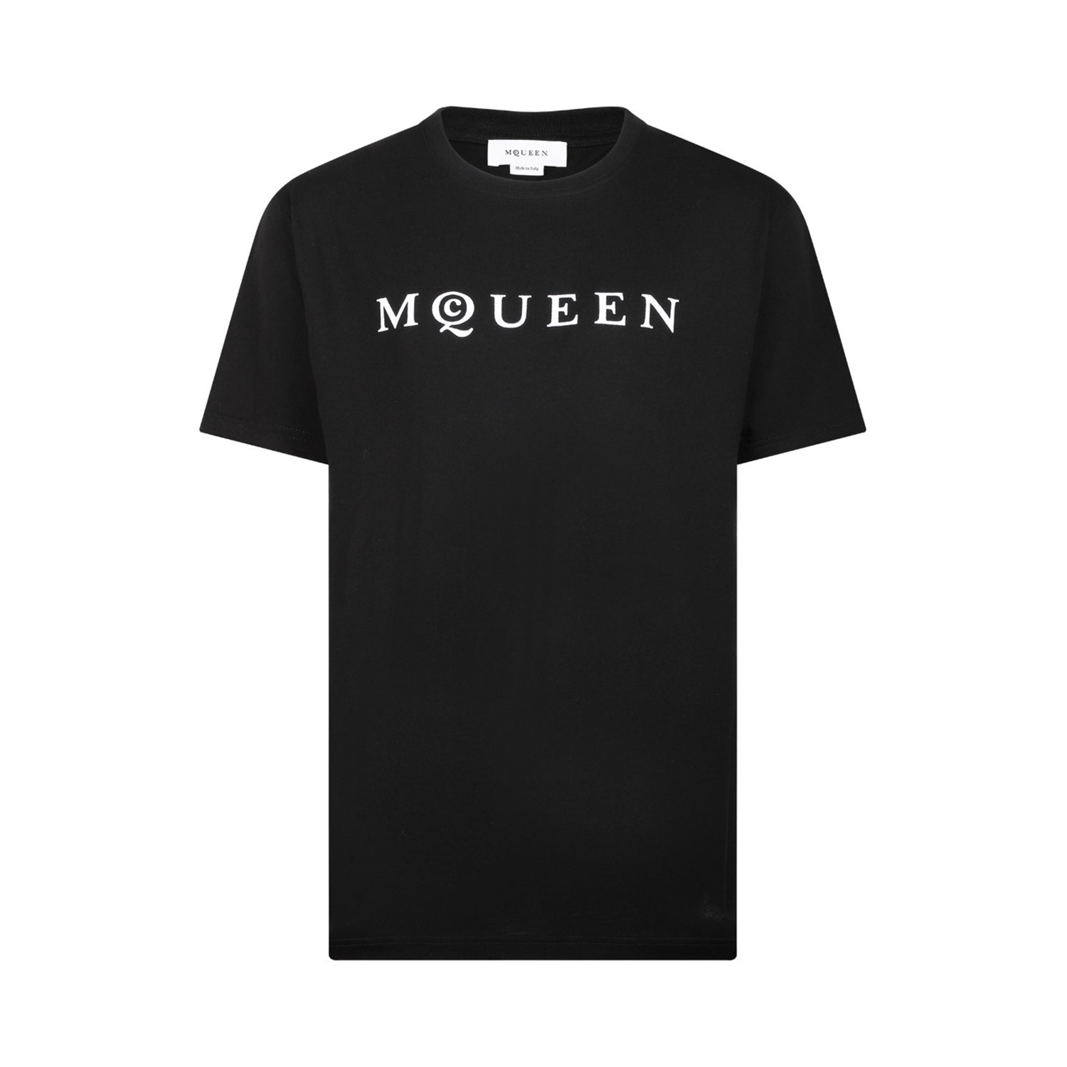 Alexander McQueen Black Flocked Logo T-Shirt. Black flocked-logo t-shirt with crew neck and short sleeves.