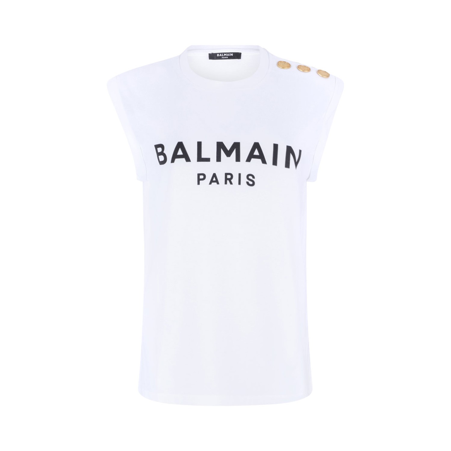 Balmain White and Black Logo Print Tank Top. White and black cotton tank top with logo print to the front, button fastening at the shoulder. Round neck, sleeveless, straight hem.