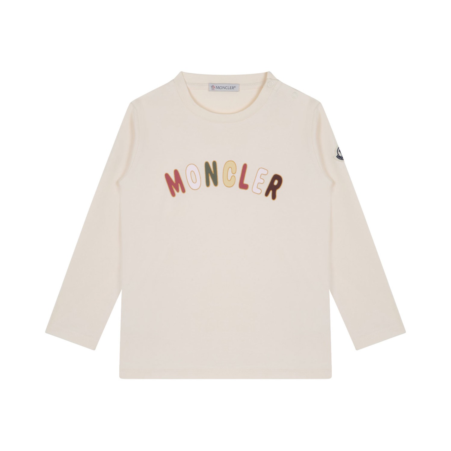 Moncler Enfant White Logo Print T-Shirt. White crew neck t-shirt, long sleeves, press stud fastening at the shoulder. Logo print to the front, logo patch at the sleeve, straight hem.