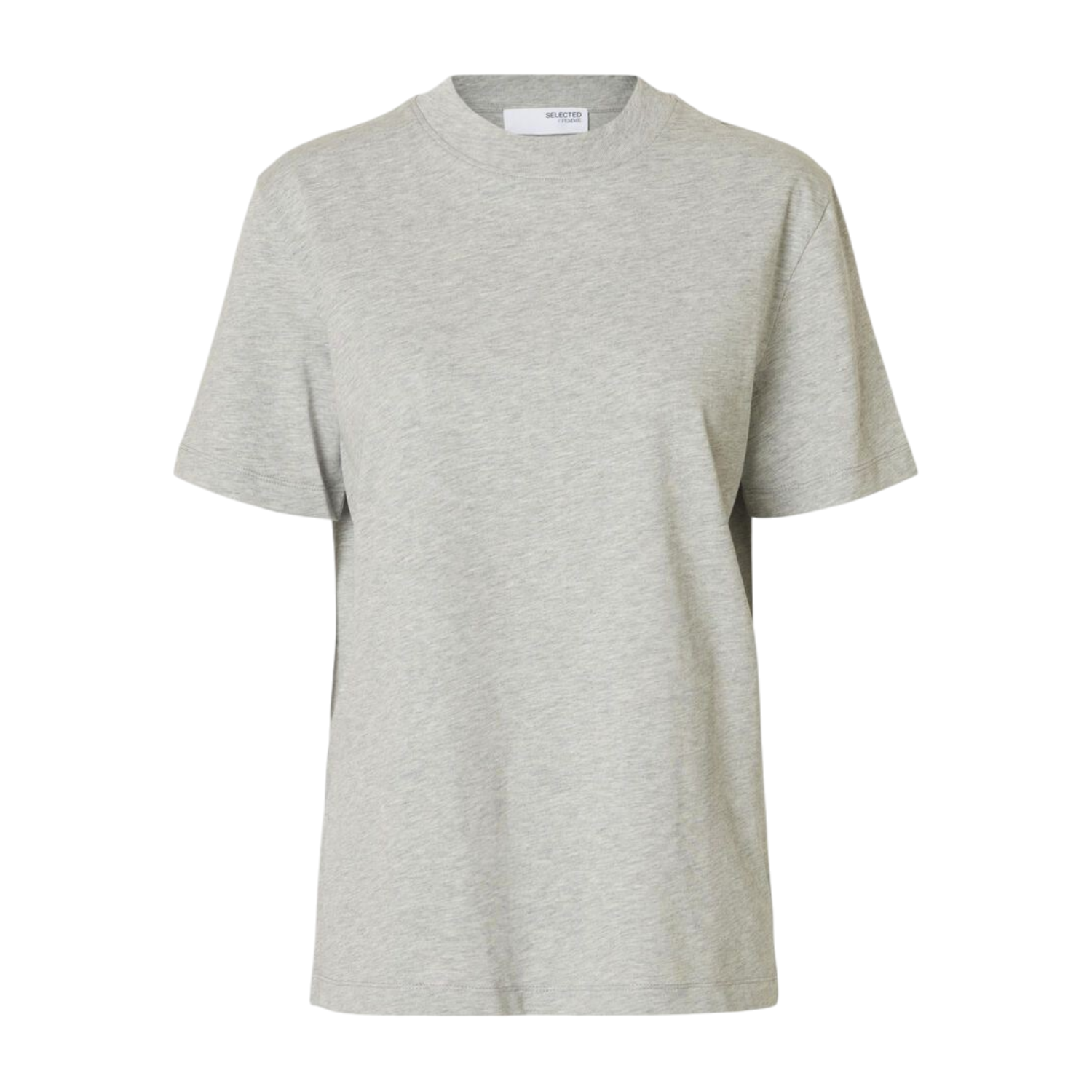 Selected Light Grey Melange T-Shirt. Light grey melange cotton t-shirt, mock-neck collar, slightly dropped shoulders, short sleeves.