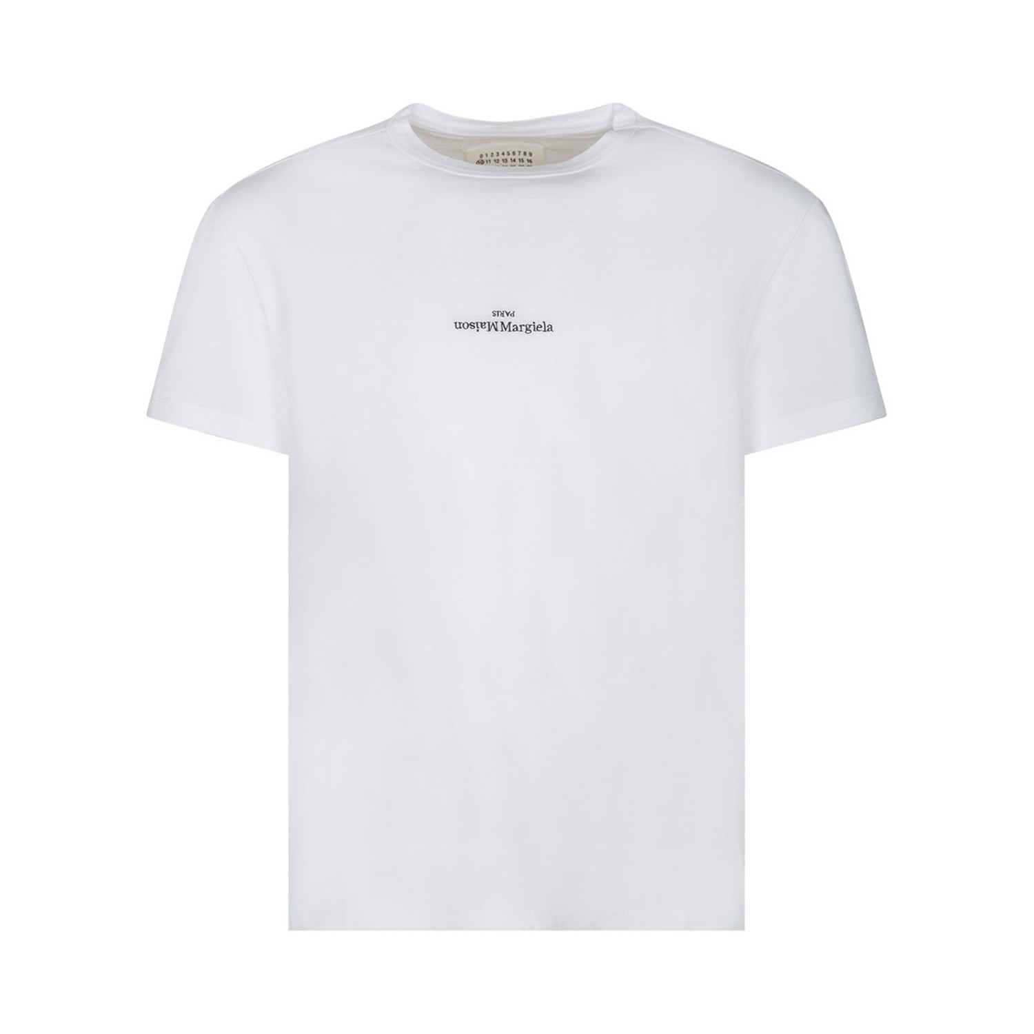 Maison Margiela White Logo T-Shirt with upside-down embroidered black logo on the chest, short sleeves and crewneck.