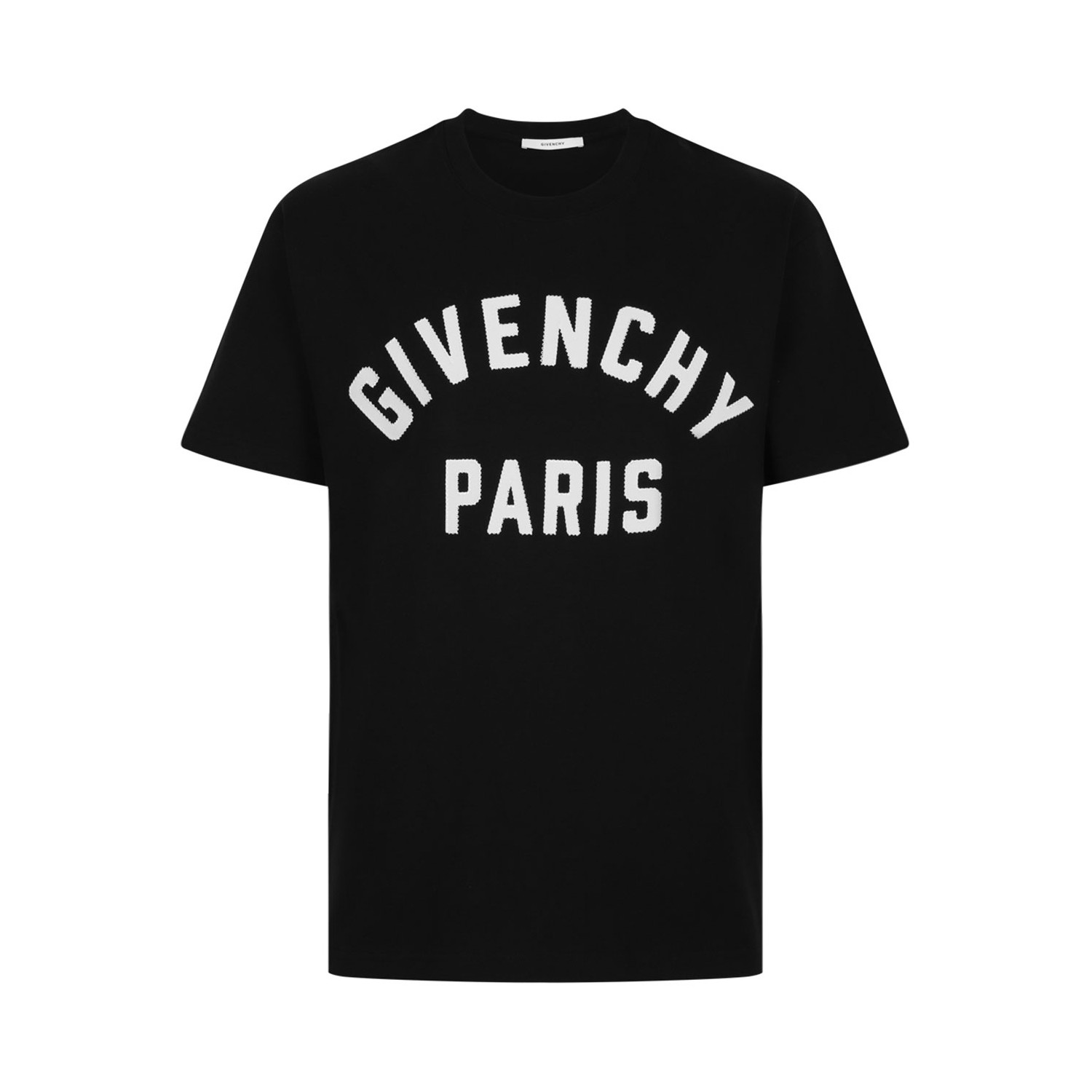 Givenchy Black Logo Embroidered Cotton T-Shirt. Black short-sleeved cotton t-shirt with choker, logo grosgrain applique with embroidered zigzag stitching on the front.