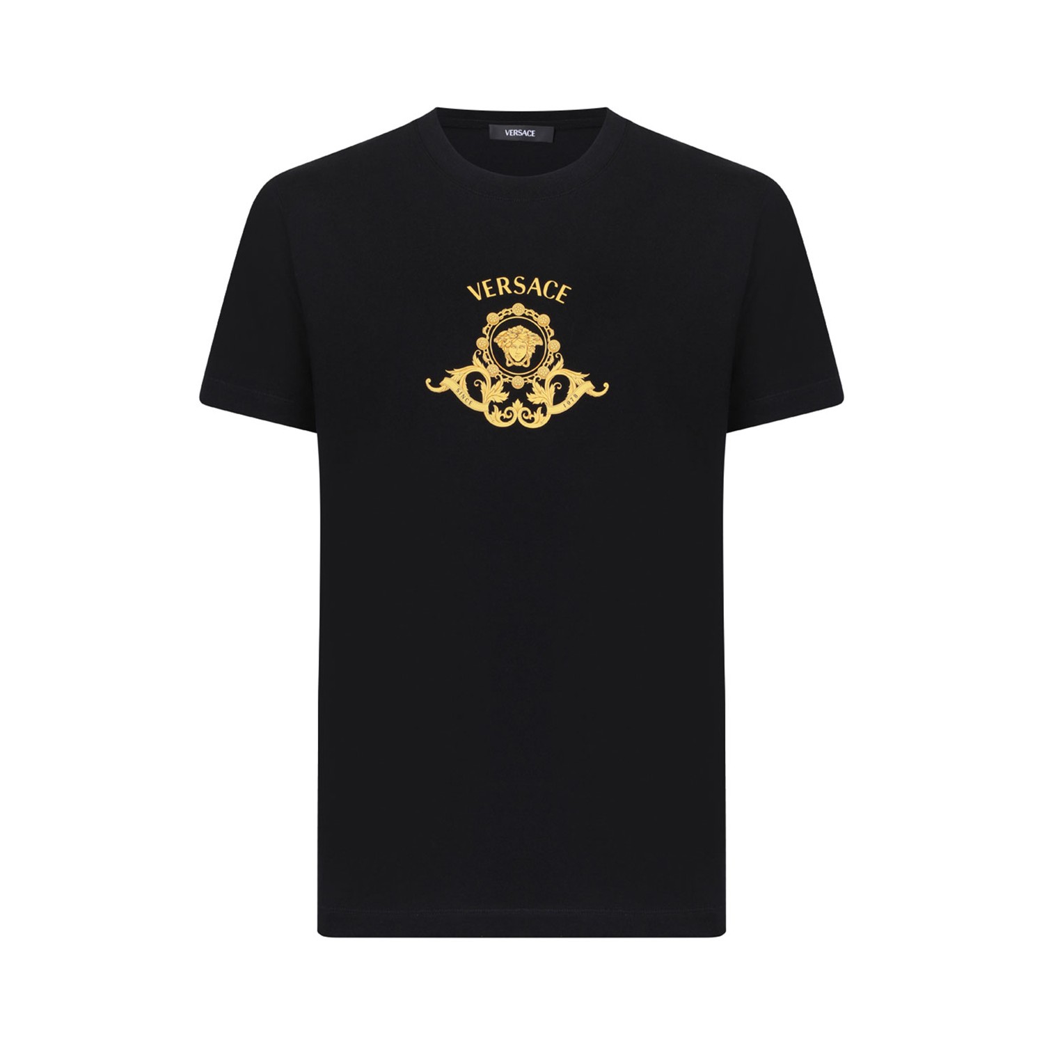 Versace Black Hall Of Heroes Crest T-Shirt. Black cotton t-shirt with logo print to the front, crew neck, short sleeves.
