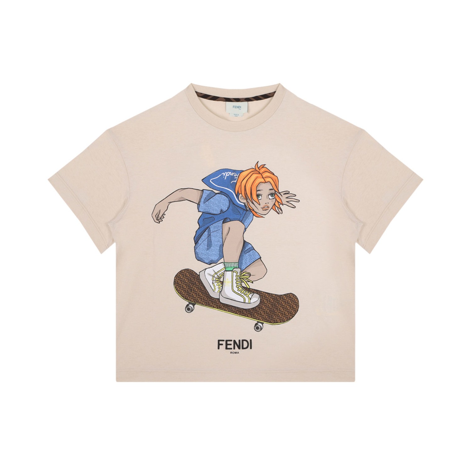 Fendi Kids Light Beige Cotton Graphic Print T-Shirt. Light beige cotton t-shirt with crew neck, short sleeves, graphic print to the front.