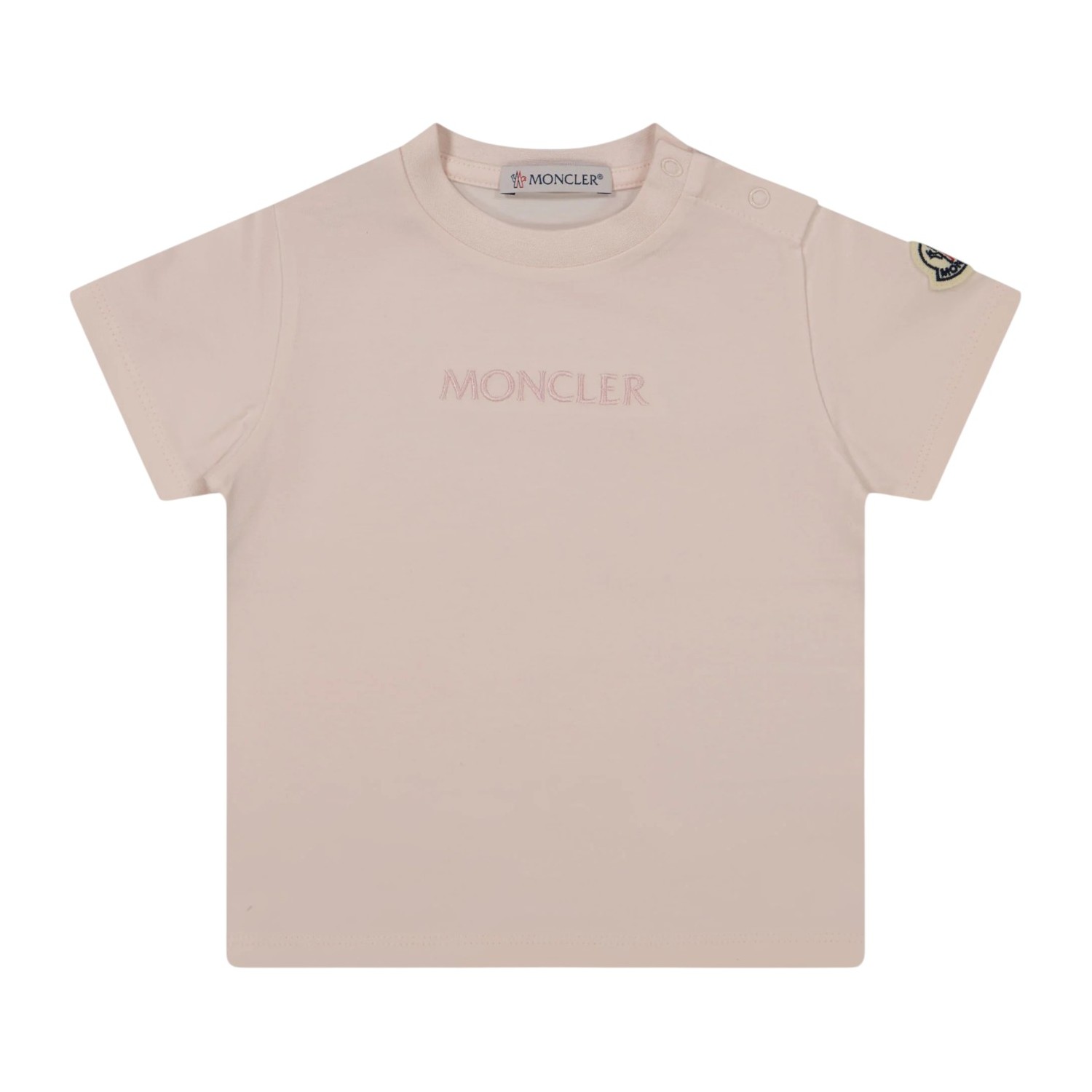 Moncler Kids Light Pink Logo Embroidered T-Shirt. Light pink cotton blend t-shirt with logo embroidered to the front, logo patch to the sleeve, crew neck and short sleeves.
