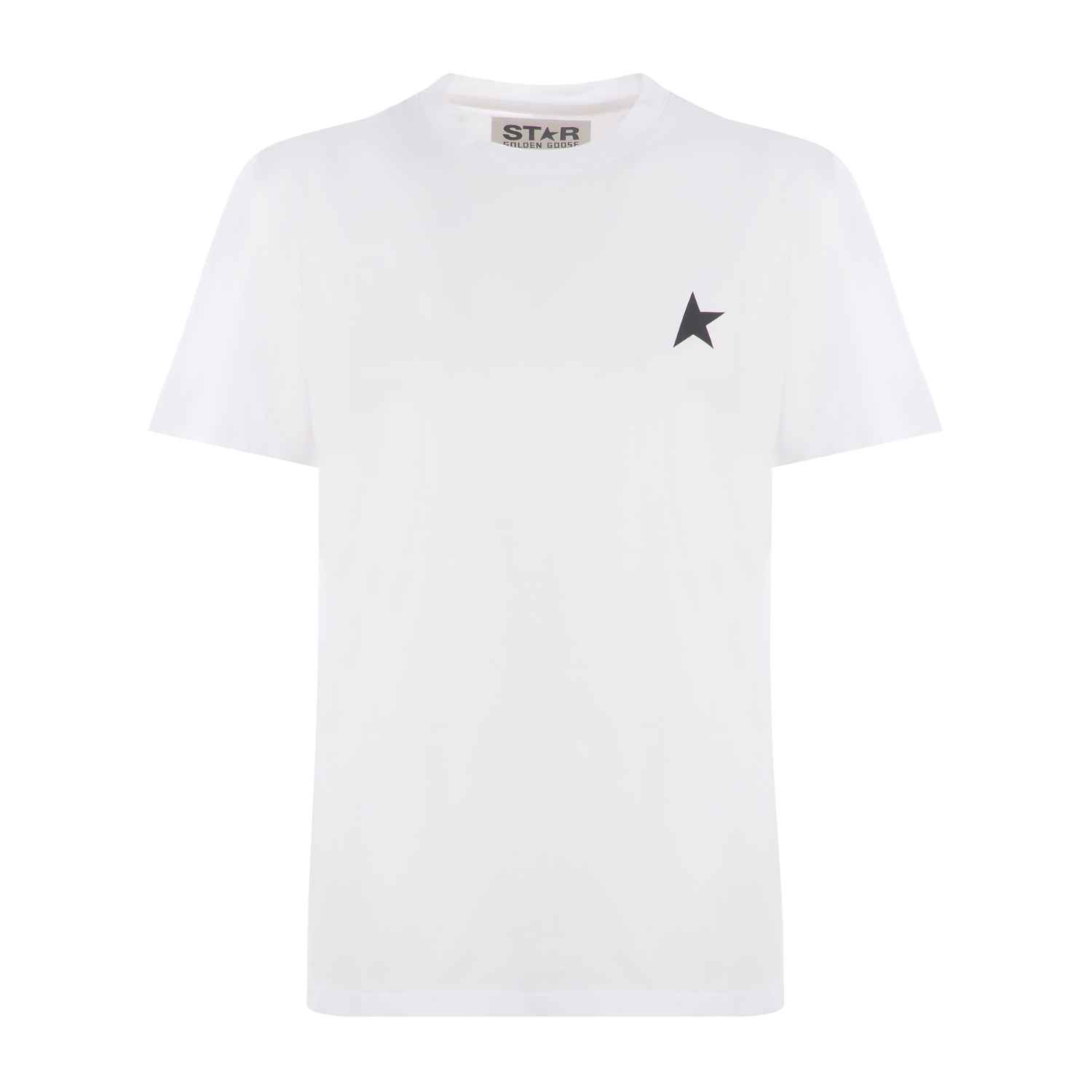Golden Goose White Star Print Cotton T-Shirt. White cotton t-shirt with ribbed crewneck, short sleeves. Contrasting black "Star" logo print on the chest.
