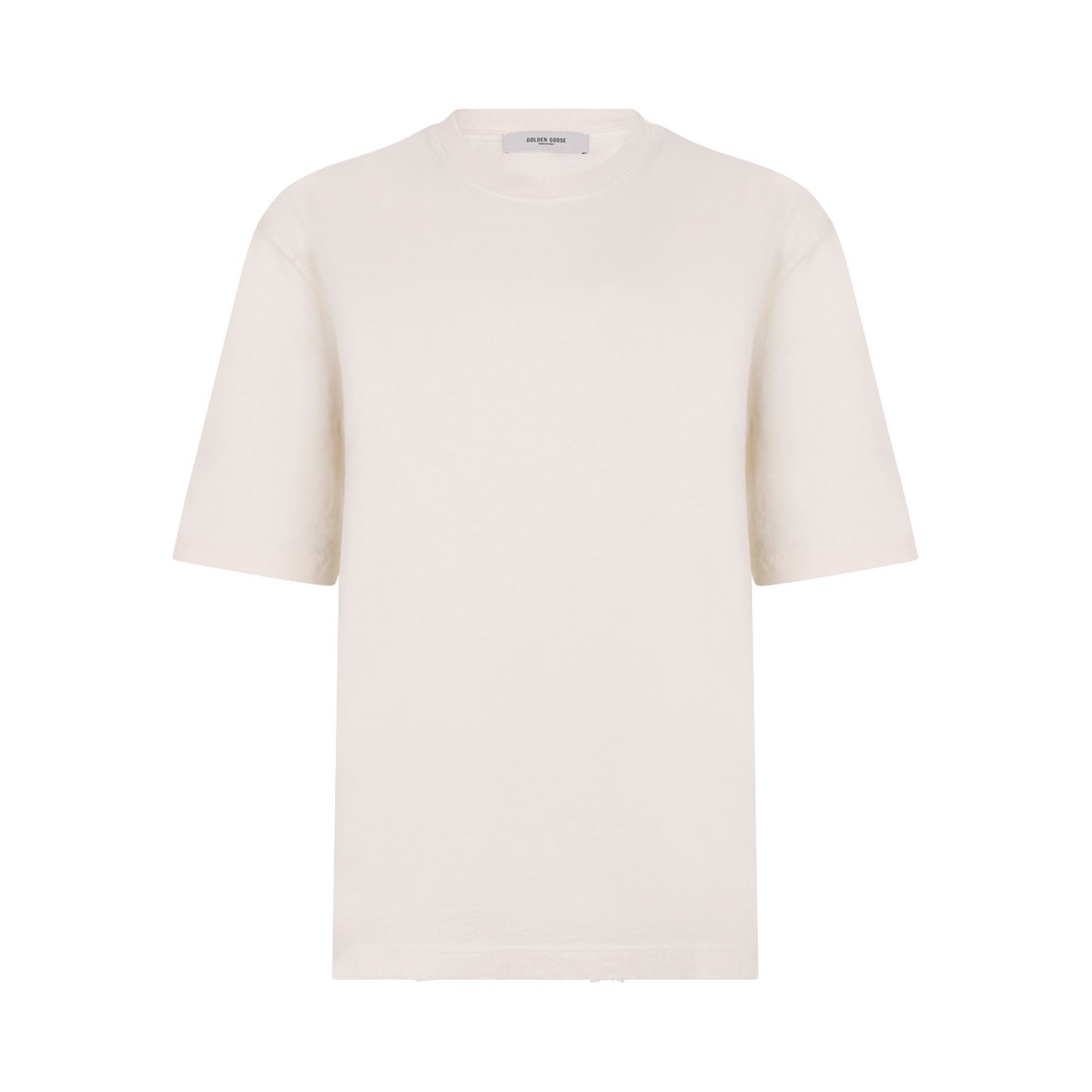 Golden Goose Relaxed Fit T-Shirt With Logo Patch. Relaxed fit t-shirt with ribbed crew neck, "Golden Goose" logo patch on the back, worn effect with bleaching treatment for a vintage look, two embroidered stars to the rear.